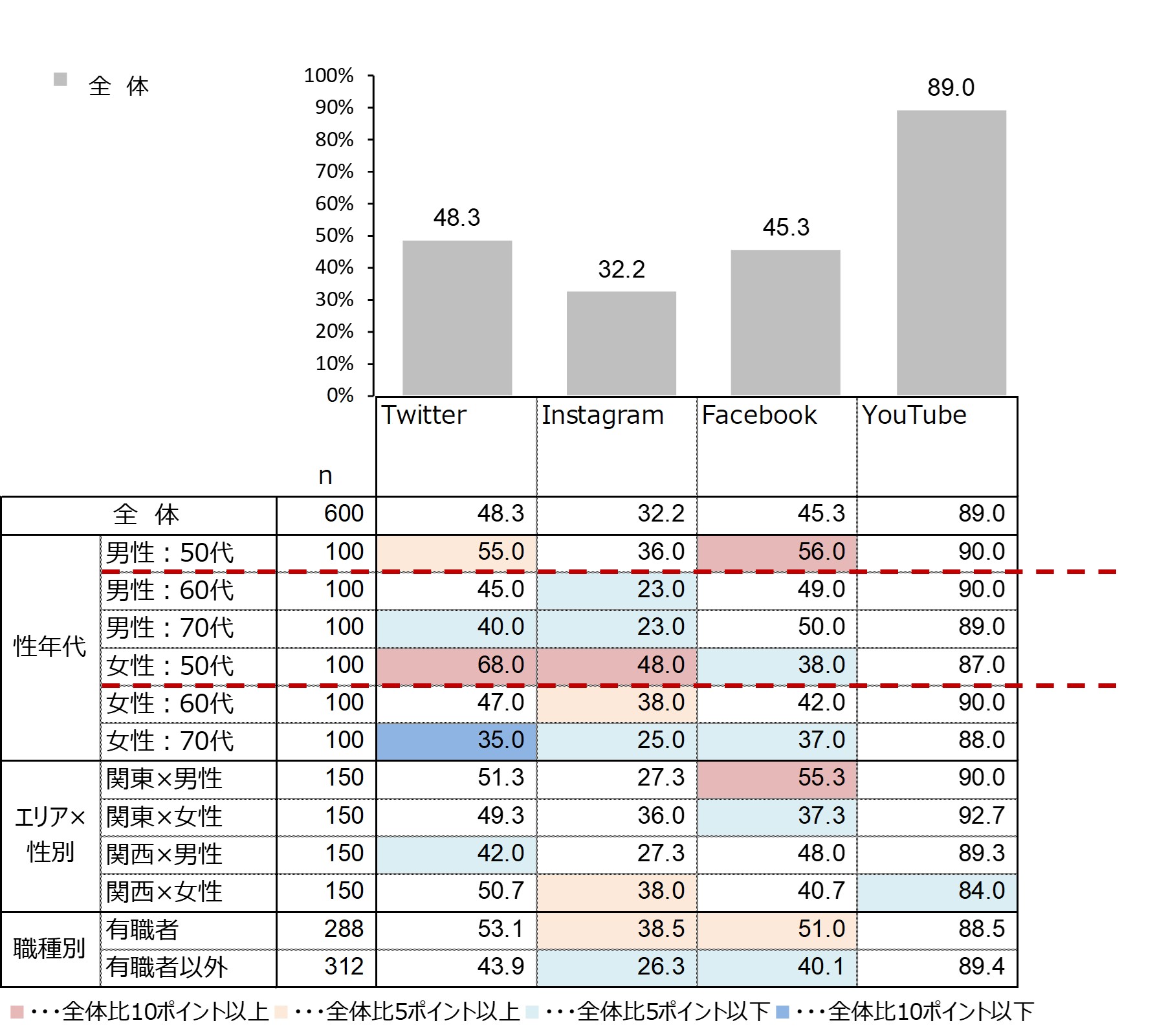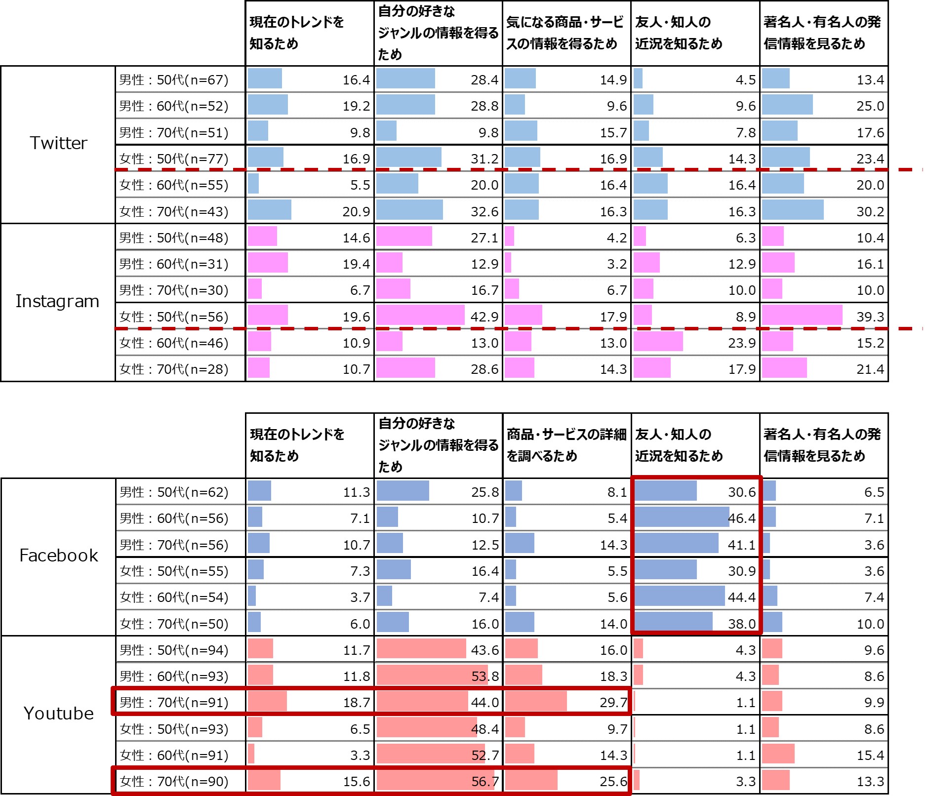 この結果からは、Twitter(現:X)とInstagramは、シニアの境として60代であることがわかり、Facebookではあまりそういった差は見られませんでした。これは、Facebookの利用目的のメインとして「友人・知人の状況を知るため」に使われていることが一つ要因としてあるかもしれません。また、YouTubeの利用目的については、シニア層が「SNS」としてではなく、主に情報収集や趣味としての動画視聴ツールとして捉えている傾向があることがわかります。