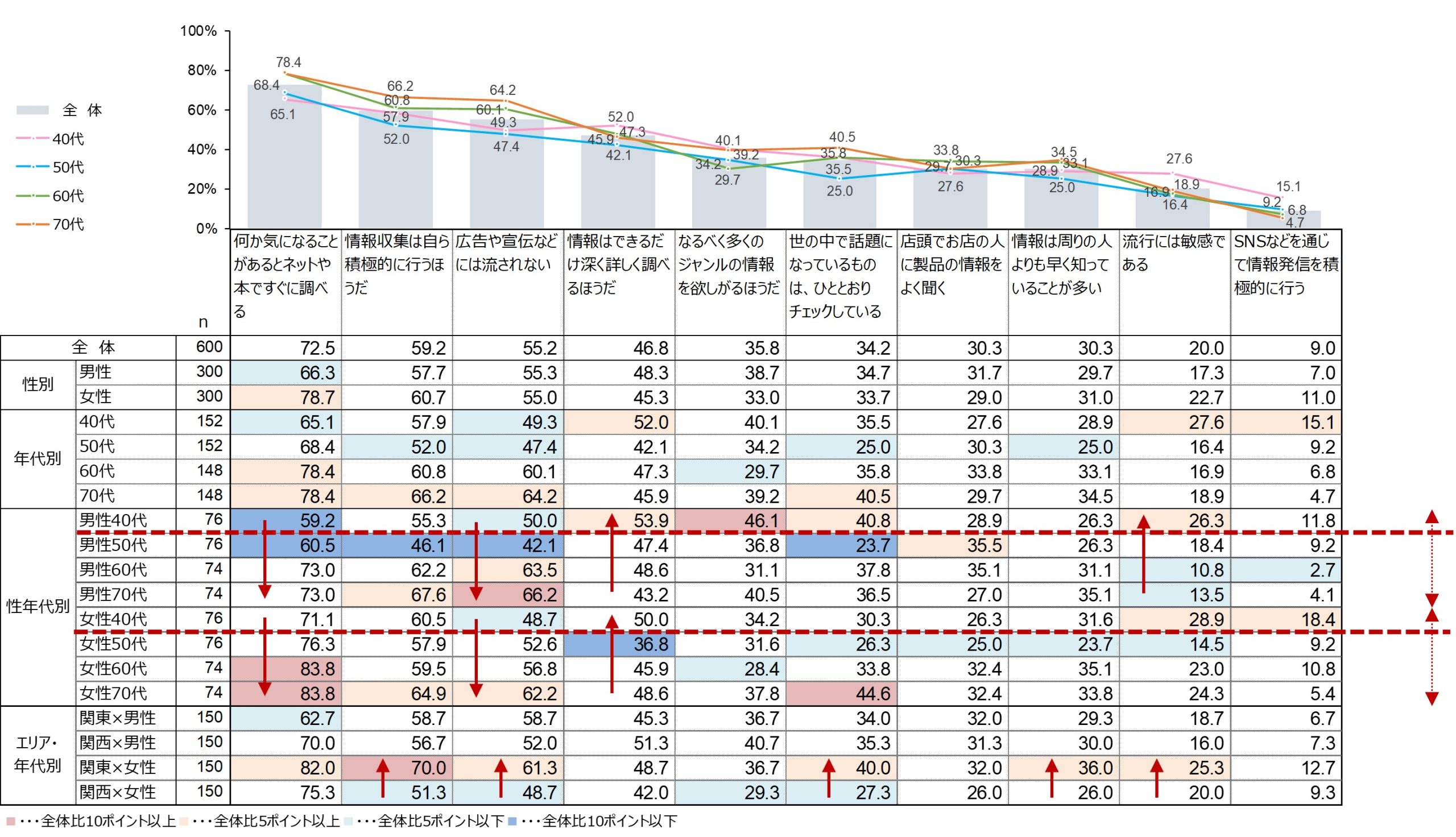 この結果から、男女間でやや傾向に違いが見られました。50代を境に広告に対する影響度が低くなる一方で、気になっていることは自分で調べる習慣を持つようになる傾向が見られました。この傾向は、特に女性の方で顕著に見られました。そのため、シニアに向けた広告や宣伝において、男女の差も考慮して企画を作成する必要があると言えそうです。