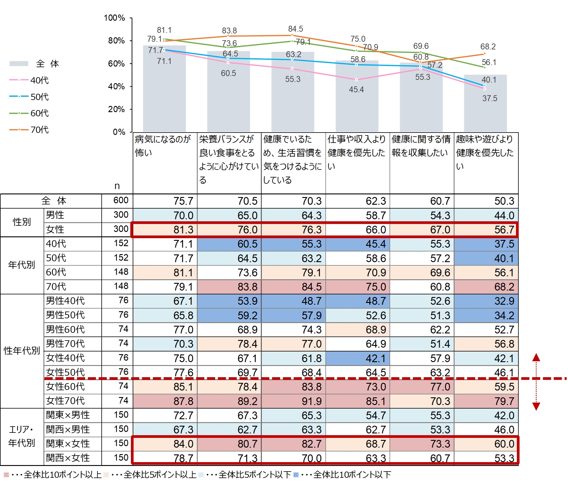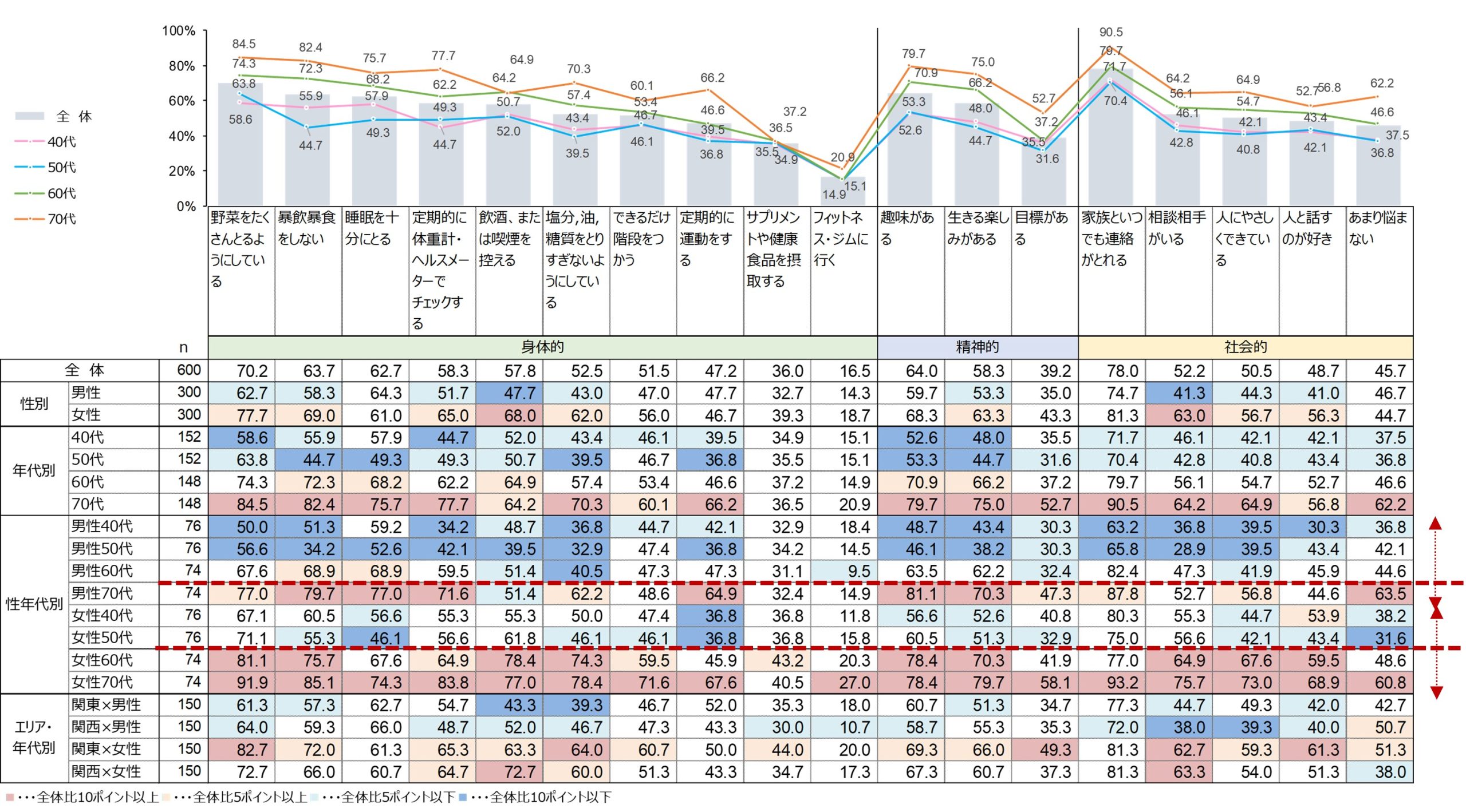 この結果から、行動に関しても男女で違いがあり、男性は70代で行動パターンが変化し、70代になると健康維持への取り組みが増加する傾向が見られます。一方、女性は60代を境に急激に健康に対する行動が増加し、食生活の改善や運動習慣の導入など、積極的に取り組む姿勢が見られます。このような男女間の健康に対する意識と行動の違いは、押さえておくべきポイントになります。