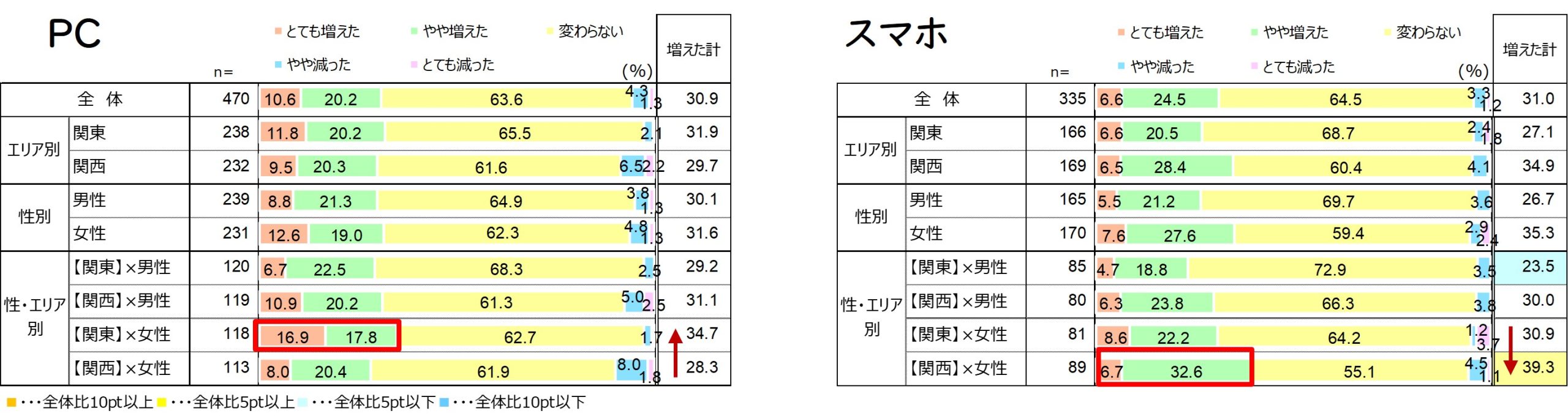 この結果から、関東地方の女性で「利用頻度が増えた(計)」と答えた人が約35%でした。さらに、関西地方の女性においては、スマートフォンの利用頻度が特に増加しており、約40%でした。このように、これまでネット利用に消極的であったシニア世代も、積極的にデジタル機器を利用するような傾向が見られます。
