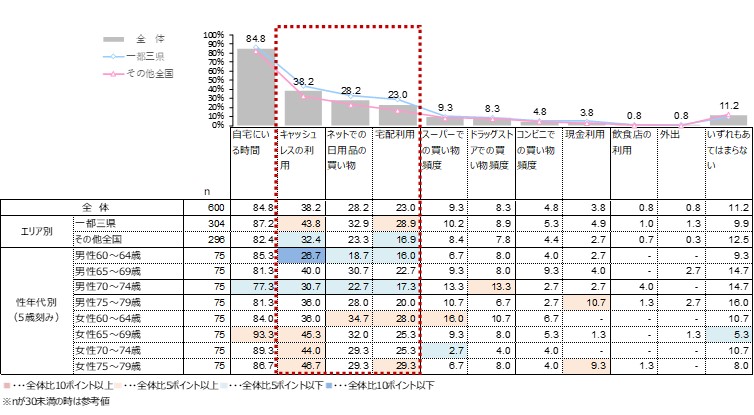 この結果から、男女間での差が顕著に見られる点と女性がキャッシュレス決済やネットでの買い物、宅配などを積極的に利用している点がわかります。