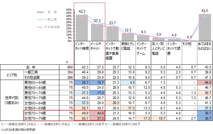 この結果から、特に70代以上の女性において、インターネットを利用することへの積極性が増しております。そのため、コロナ禍により、対面でのコミュニケーションや外出が制限されたことで、シニア世代もネットの必要に迫られ、オンラインを活用するようになったという背景が考えられます。その結果、ネットを使うことがシニア世代の新しい生活スタイルの一部として定着しつつあるのでしょう。