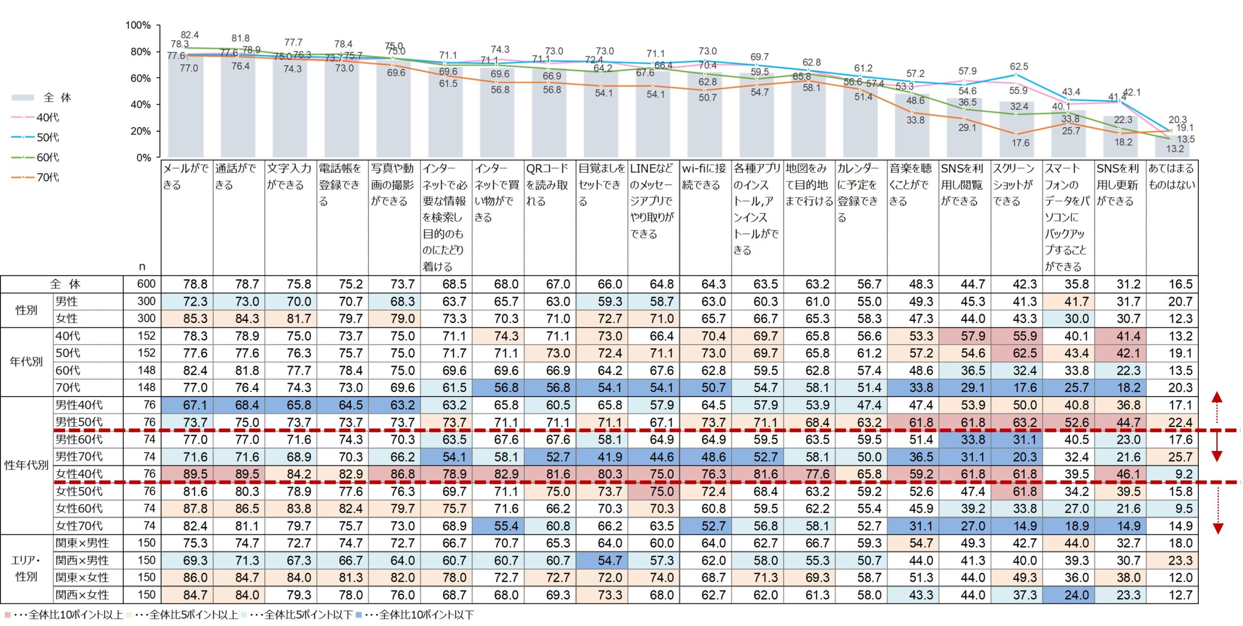 この結果から、「スマホのリテラシー」においても男女で違いがあることが分かります。男性は60代、女性は50代を境に「スマホのリテラシー」に差が生じ、スマホの使いこなし度が低下する傾向にあります。憶測として、要因はさまざま考えられますが、例えば、仕事をしている男性と専業主婦という分類で考えると、『仕事で使用する範囲』と『家庭のみで使用する範囲』で異なる可能性があり、そういった要因が影響しているかもしれません。