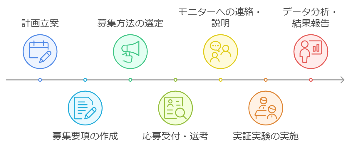実証実験のモニター募集は、一般的に以下の流れで行われます。