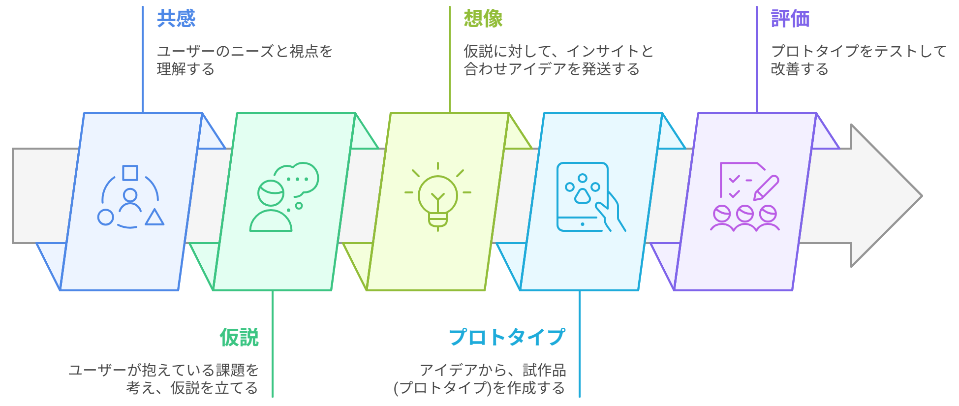 デザイン思考は、「共感」から始まり、ユーザーの視点に立って課題を見つけ出し、創造的な解決策を導くためのフレームワークです。