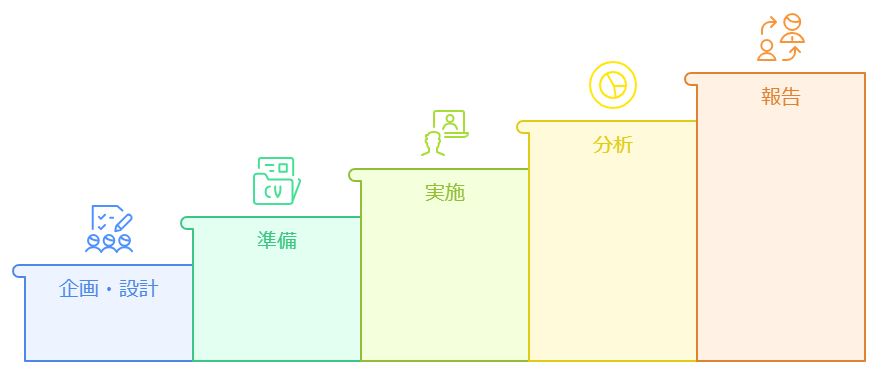フォーカス・グループ・ディスカッションを効果的に実施するには、事前の準備から集計・分析まで、しっかりとした計画と準備を進めることが大切です。一般的なフォーカス・グループ・ディスカッション実施の流れは、以下の通りです。