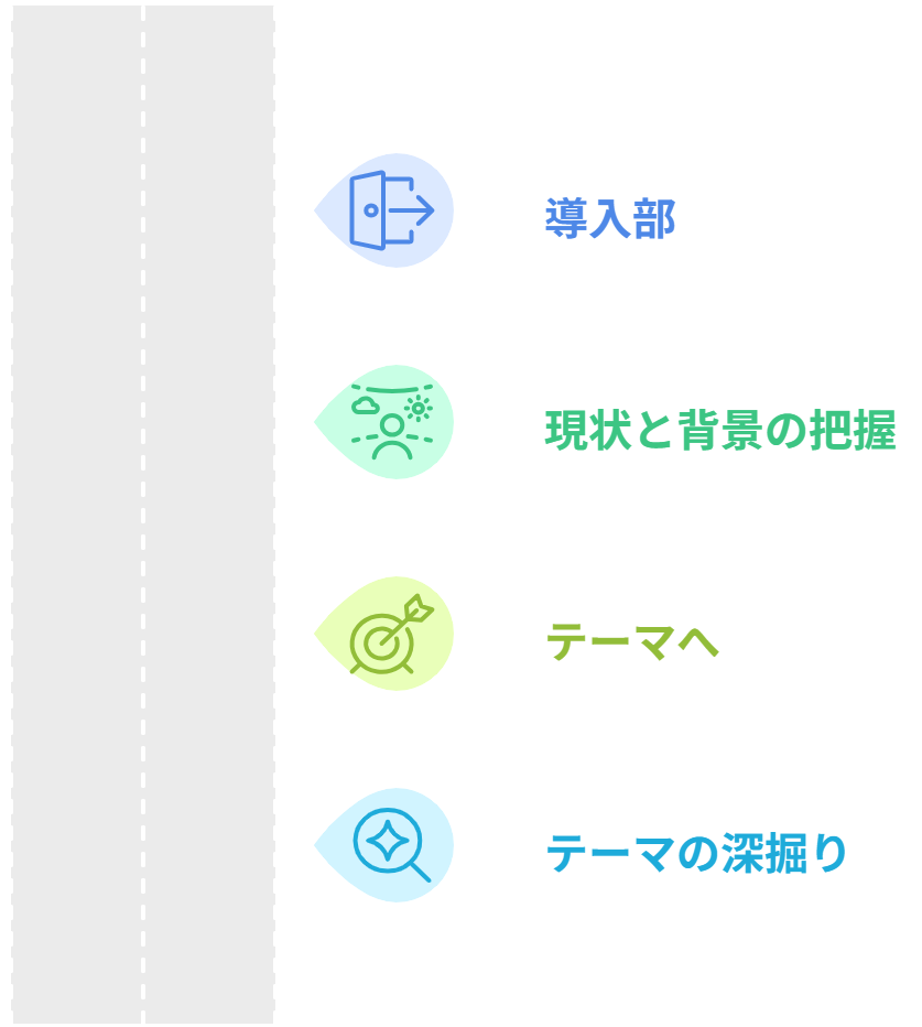 グループインタビューでは、参加者の本音や深層心理に迫れるよう、段階的に質問を進めていく構成が基本となります。そのため、進行表を作成する際には、インタビュー全体の一般的な流れを意識して設計することが大切です。