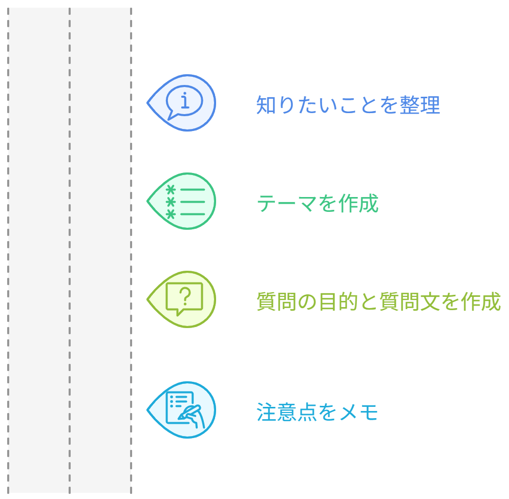 | 3. 記憶を辿ってもらう必要があるテーマ | 「過去の行動や体験」に関するテーマ | 記憶を辿ってもらう必要があるテーマ、たとえば、過去の行動や体験に関するテーマで質問を行っていき、具体的なエピソードや背景情報を引き出していきます。 |