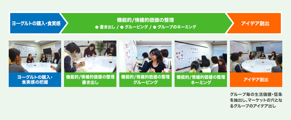 インタビューの冒頭では、まず日記調査の内容を振り返りながら、「いつ」「どのように」「どのような目的で」ヨーグルトを消費しているのかについて具体的に尋ねました。例えば、朝食としてヨーグルトを食べる「喫食者」に対しては、他の朝食メニューとの比較や、ヨーグルトに求める機能性(腸内環境の改善や手軽さなど)について掘り下げています。
