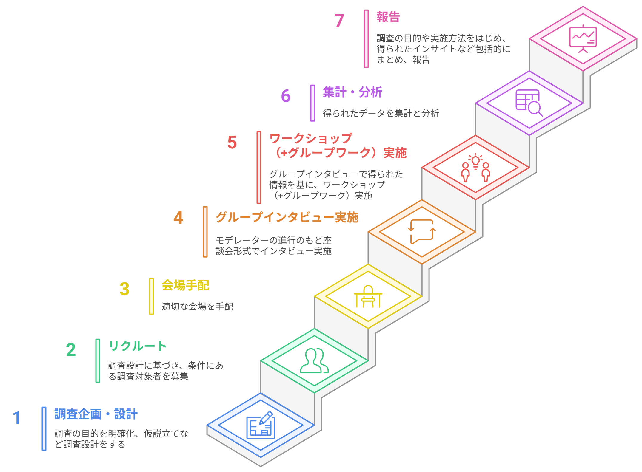 グループインタビューとワークショップ(+グループワーク)を組み合わせた調査は、下図のステップで進められます。