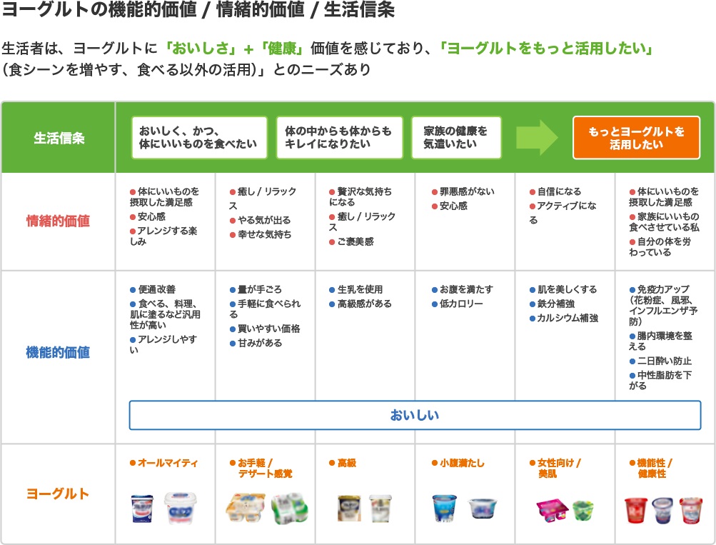 ここからはwebアンケートからでは探れない対象者の行動や発言・情報についてを探る定性調査を行なっていきます。最後に、調査全体から何が見えたのか、ヨーグルトの新価値を見出し、新商品の方向性について触れています。