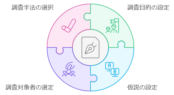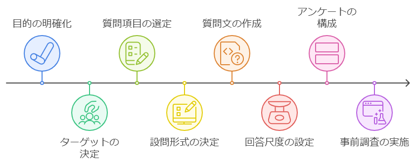効果的なアンケートを作成し、信頼性の高いデータを得るためには、以下の流れに沿って設計を進めることが重要です。