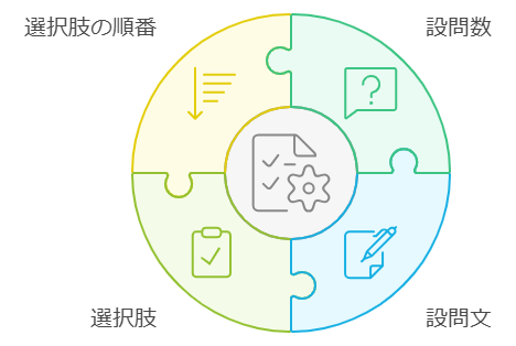 ここでは、設問設計における重要なポイントを4つに分けたイメージとなり、以下解説します。
