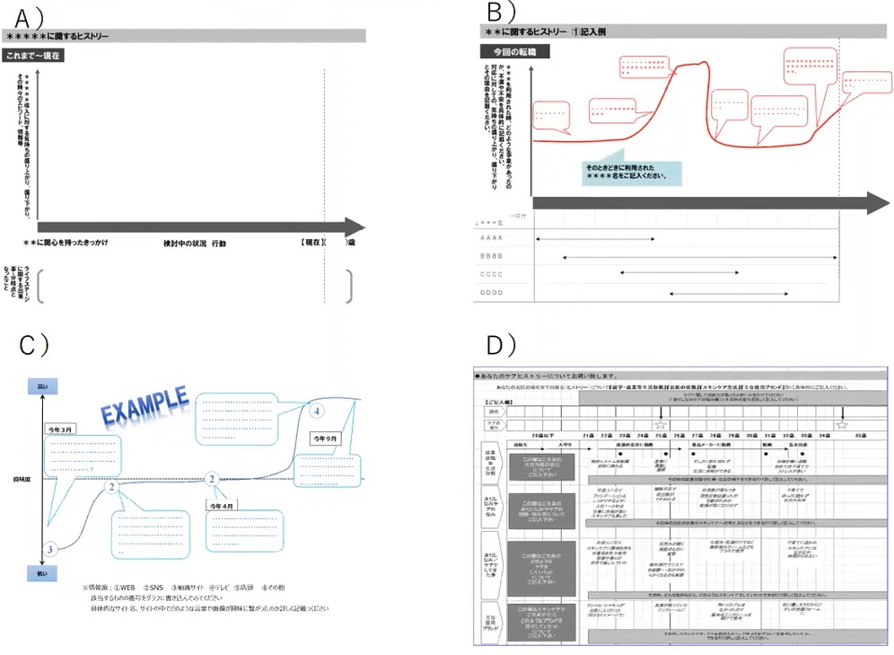 | グループインタビューなどでは、他の対象者の刺激を受ける前に可視化することができる | 発言の強い人に引っ張られ、調査対象者が盛り上がるのですが、実はそうじゃない経験をしてきている方がいるというところを、ちゃんと引き出すことができます。 |