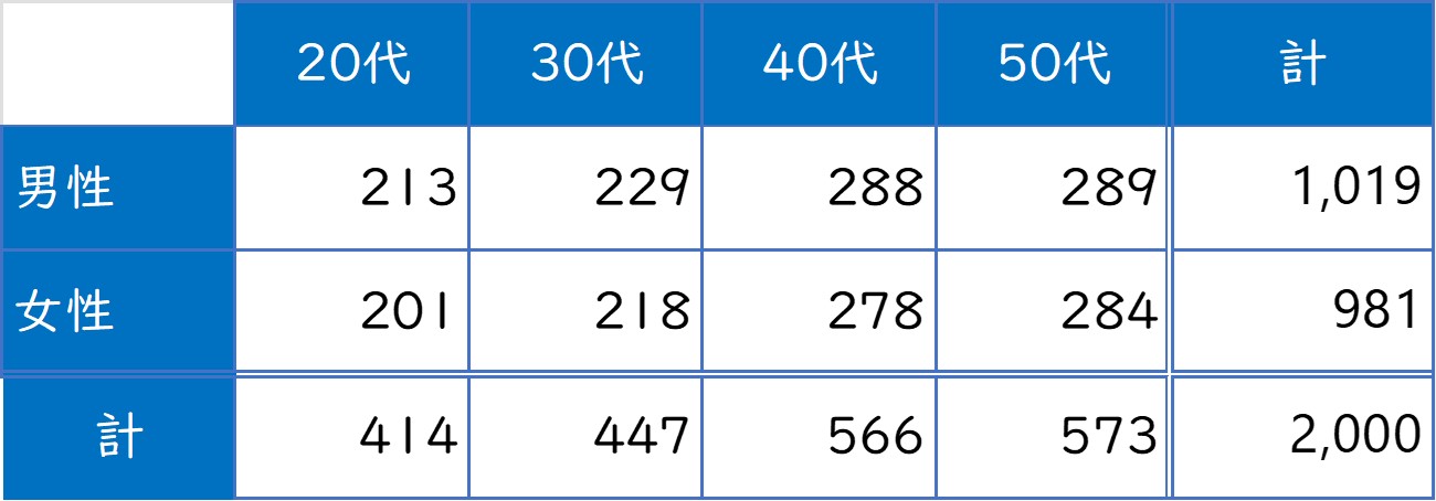 計: 2,000ss ※日本全国の人口動態に準拠して割付
