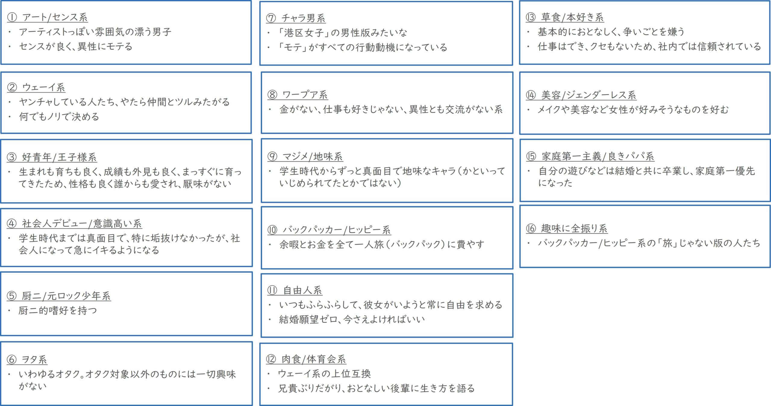 「こういうタイプの人が世の中にいるんじゃないかな?」っていう男性のタイプを調査担当者の独断と偏見で下図16パターンを用意してみました。