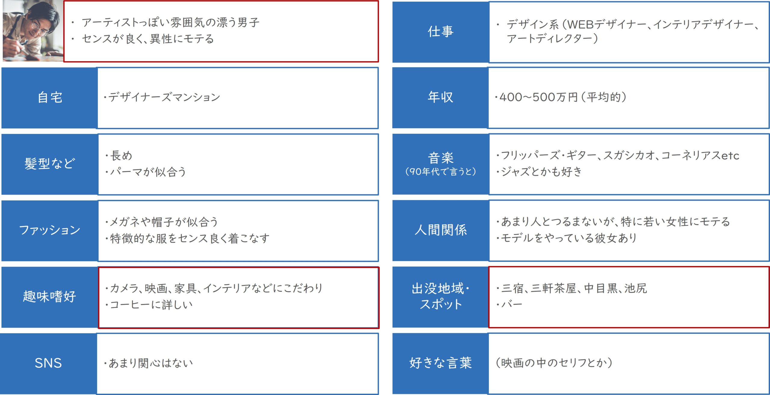 アーティストっぽい雰囲気の漂い、すごくセンスが良くて、異性にもモテるようなタイプが世の中にいるのではないか、という発想のもと仮説クラスターを立てていきました。そして、趣味嗜好で言うと、カメラや映画、家具、インテリアなどにこだわりがあり、イメージで言うと、三宿や三軒茶屋で飲んでいそうかな、と。