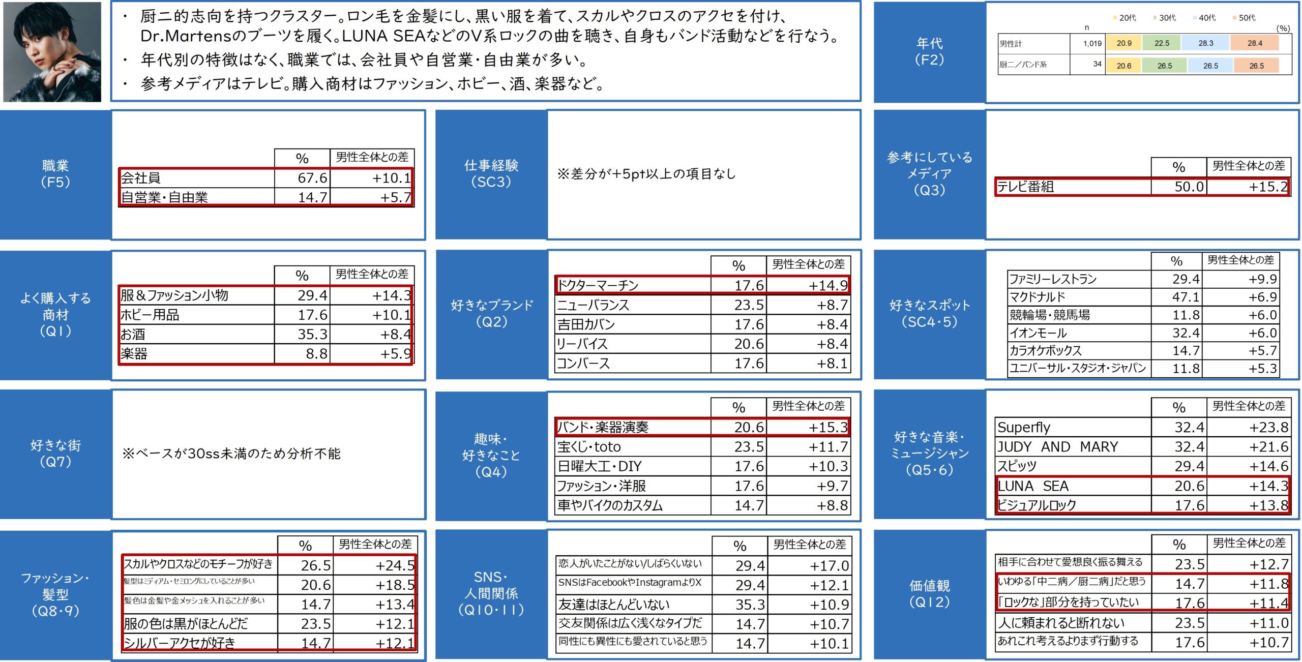 仮説クラスター⑤:厨二/元ロック少年系に近いタイプとして、クラスター⑪:厨二/バンド系をピックアップしました。