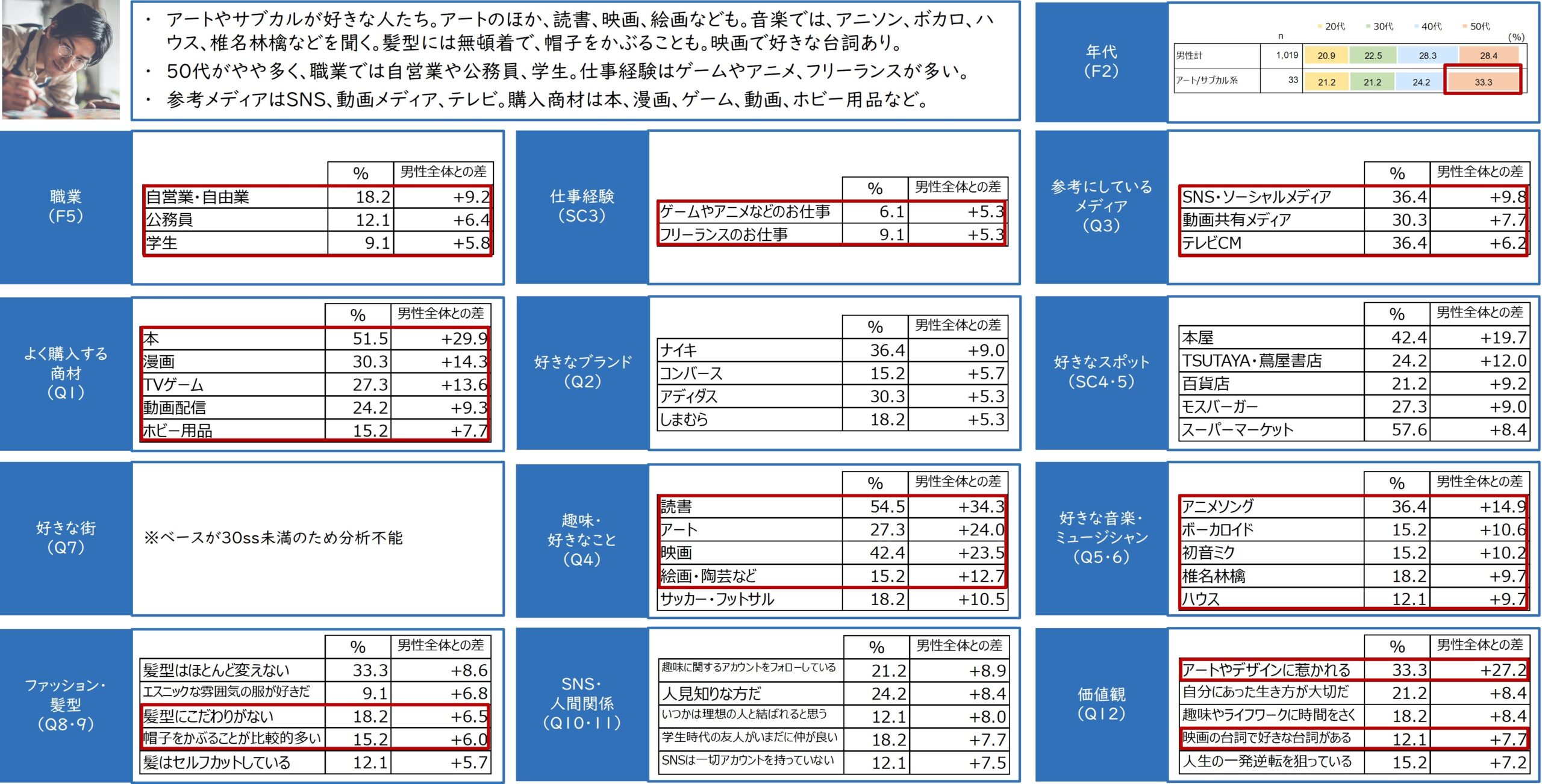 仮説クラスター①:アート/センス系に近いタイプとして、クラスター⑪:アート/サブカル系をピックアップしました。