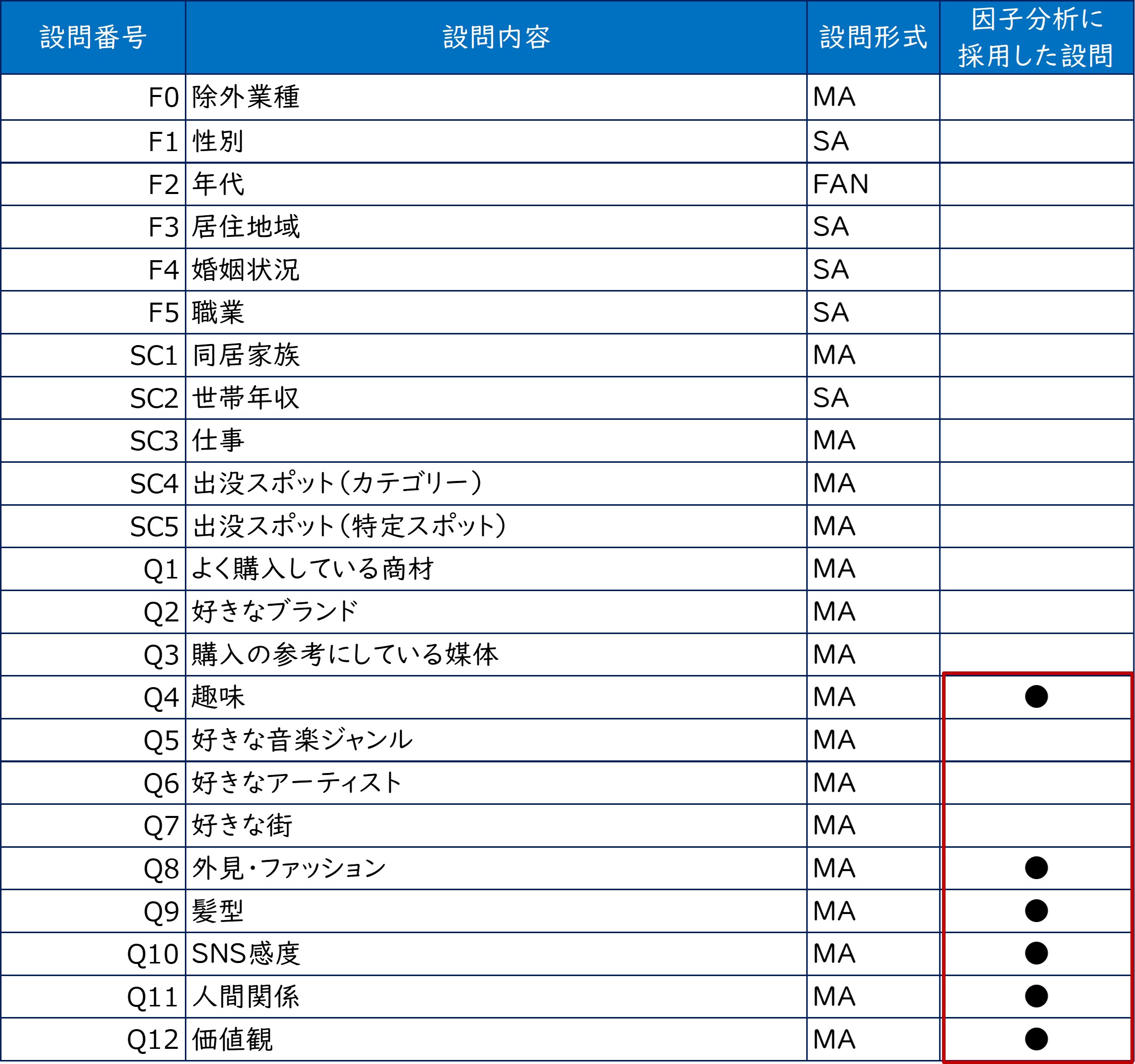 また、調査背景でご説明させていただいた因子分析は、上表の右端で●を付けた、趣味や外見・ファッションなどの設問を採用し、因子分析を行いました。