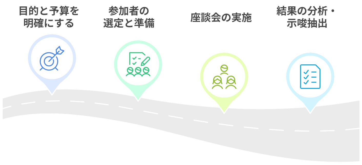 座談会を効果的に進め、質の高い意見やインサイトを引き出すためには、事前に綿密な準備が必要になってきます。以下のポイントを事前にしっかりと手配しておくことが、実施当日のスムーズな進行につながります。