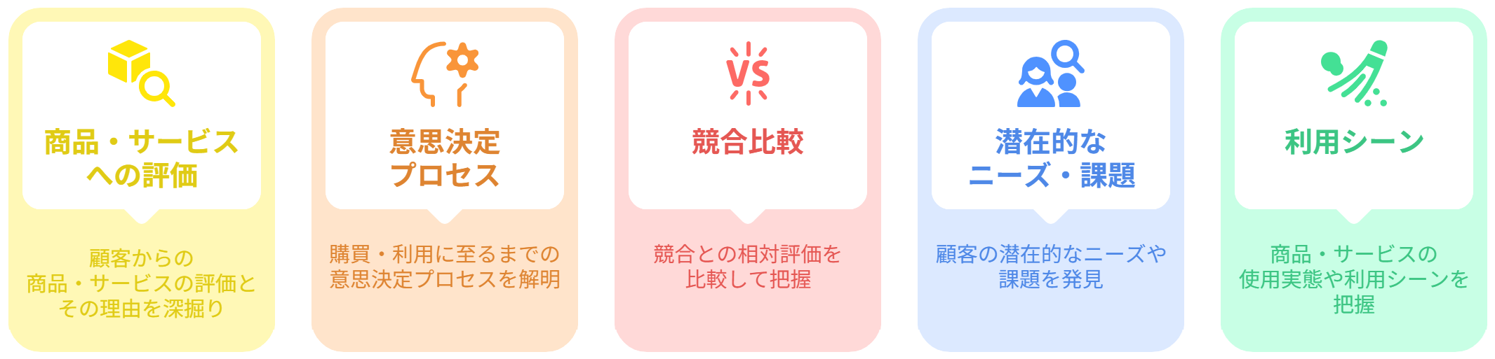 | ニーズや課題の深掘り | 製品やサービスに対するニーズがどこにあるのか、ユーザーが感じている課題は何かといった点を探り、改善や開発のヒントを得ます。 |