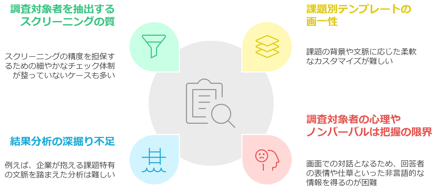AIやセルフ型調査は、手軽さと効率性という点で大きなメリットをもたらしますが、その裏には下図のような克服すべき限界点も存在します。