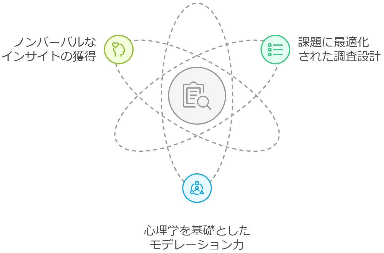 AIによる分析やセルフ型調査で得られるデータは、統計的な傾向や顕在化されたニーズを把握するには有効でしたが、ターゲット層の深層心理や潜在的なニーズを捉えるには不十分です。