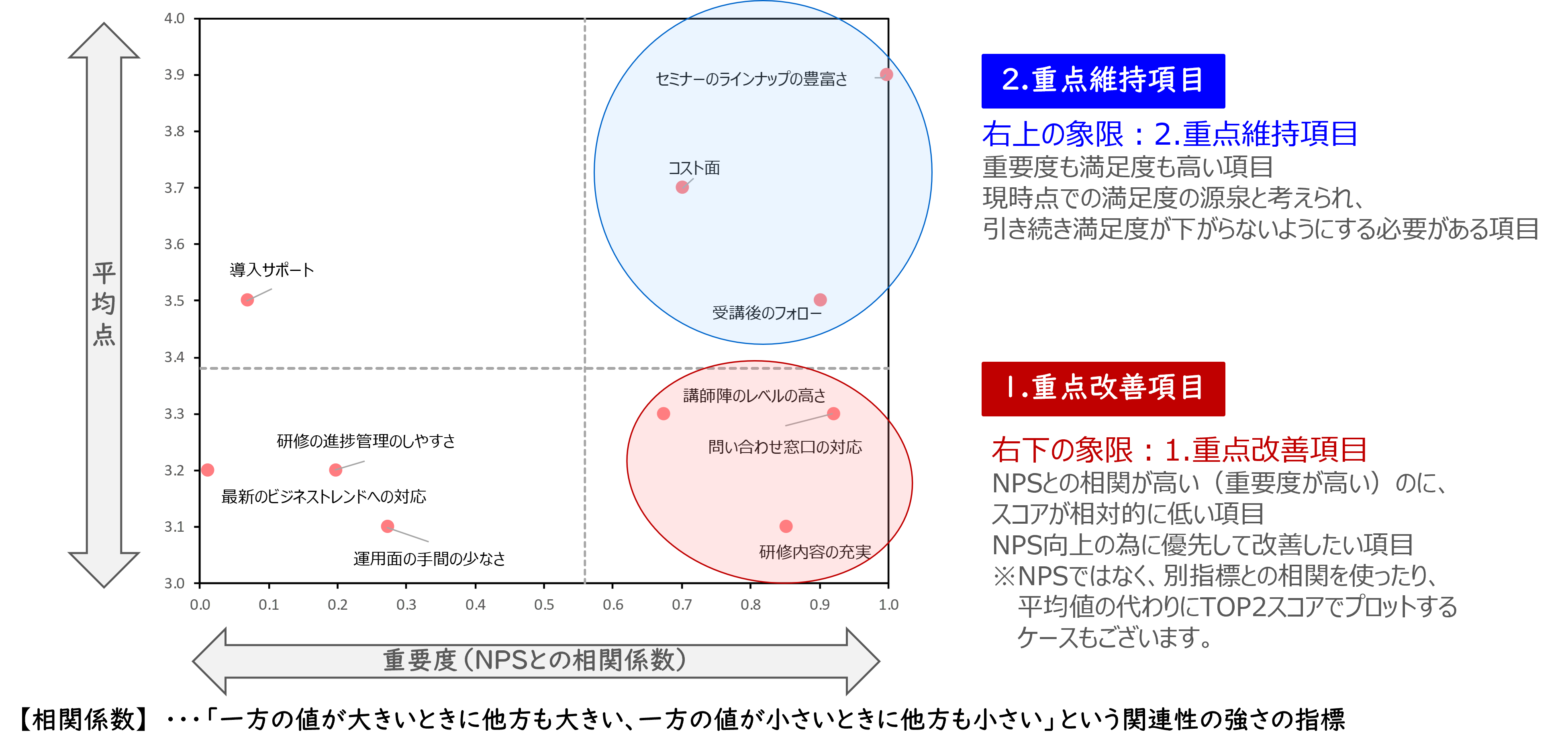 横軸に重要度(NPS®との相関係数)、縦軸に各項目のスコア(加重平均)を使い、下図のような散布図を作ります。