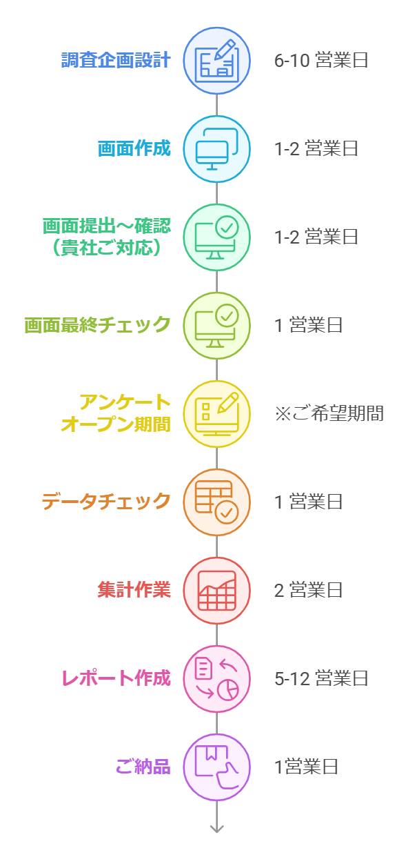 設問ごとの詳細レポートも含めたフルレポートが必要なのか、または纏め部分(サマリ)だけで良いのかによっても納期が前後します。