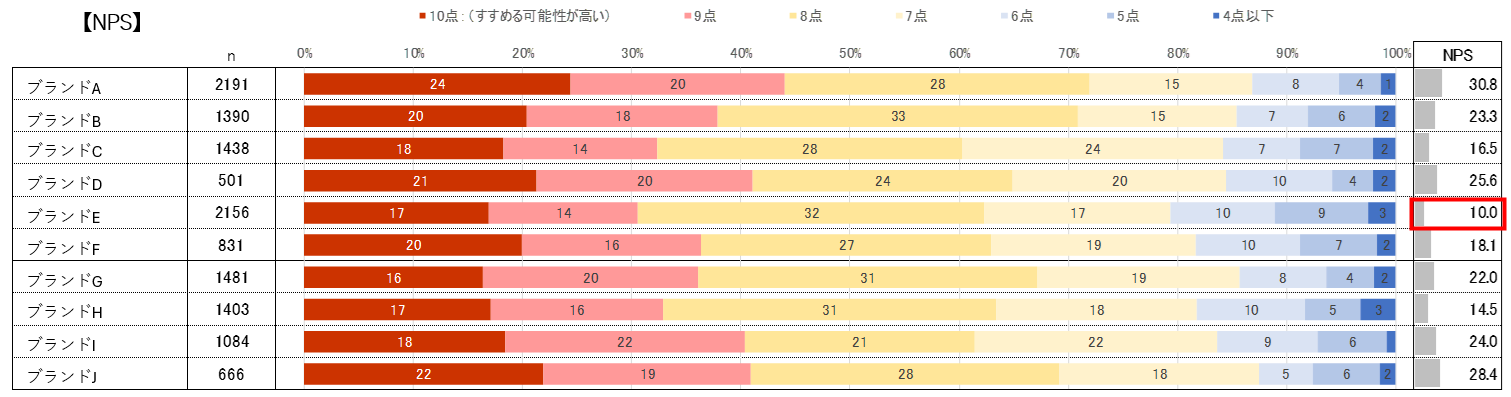 例えば、他社との比較として下表を見てみると、ブランドEやHのNPS®のスコアが低く、批判者の割合が多いことが分かります。