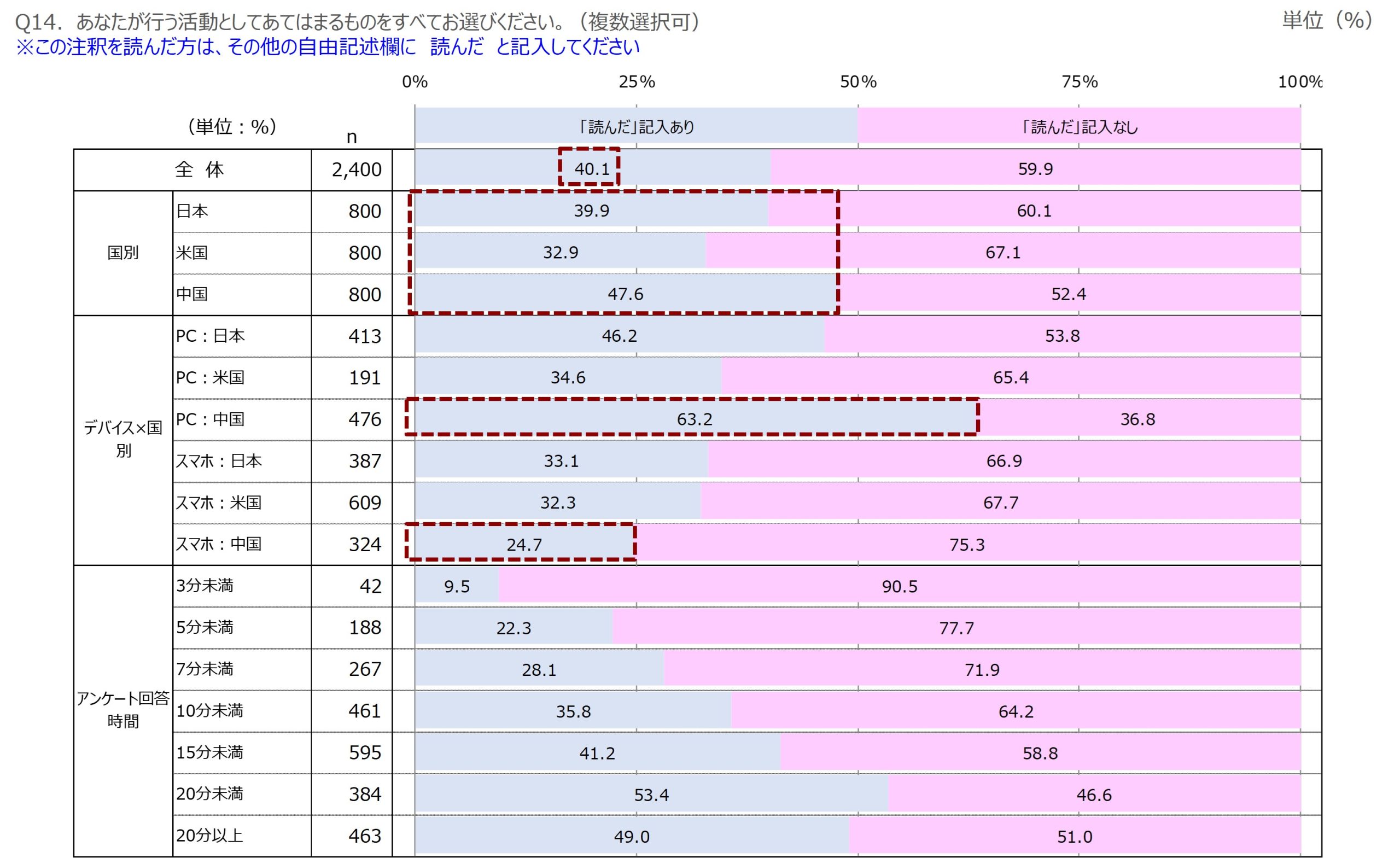 まず、「全体」と「国別」を見てみると、「読んだ」を記載があったのは約40%となり、注釈に従ったのは中国>日本>米国の順となりました。