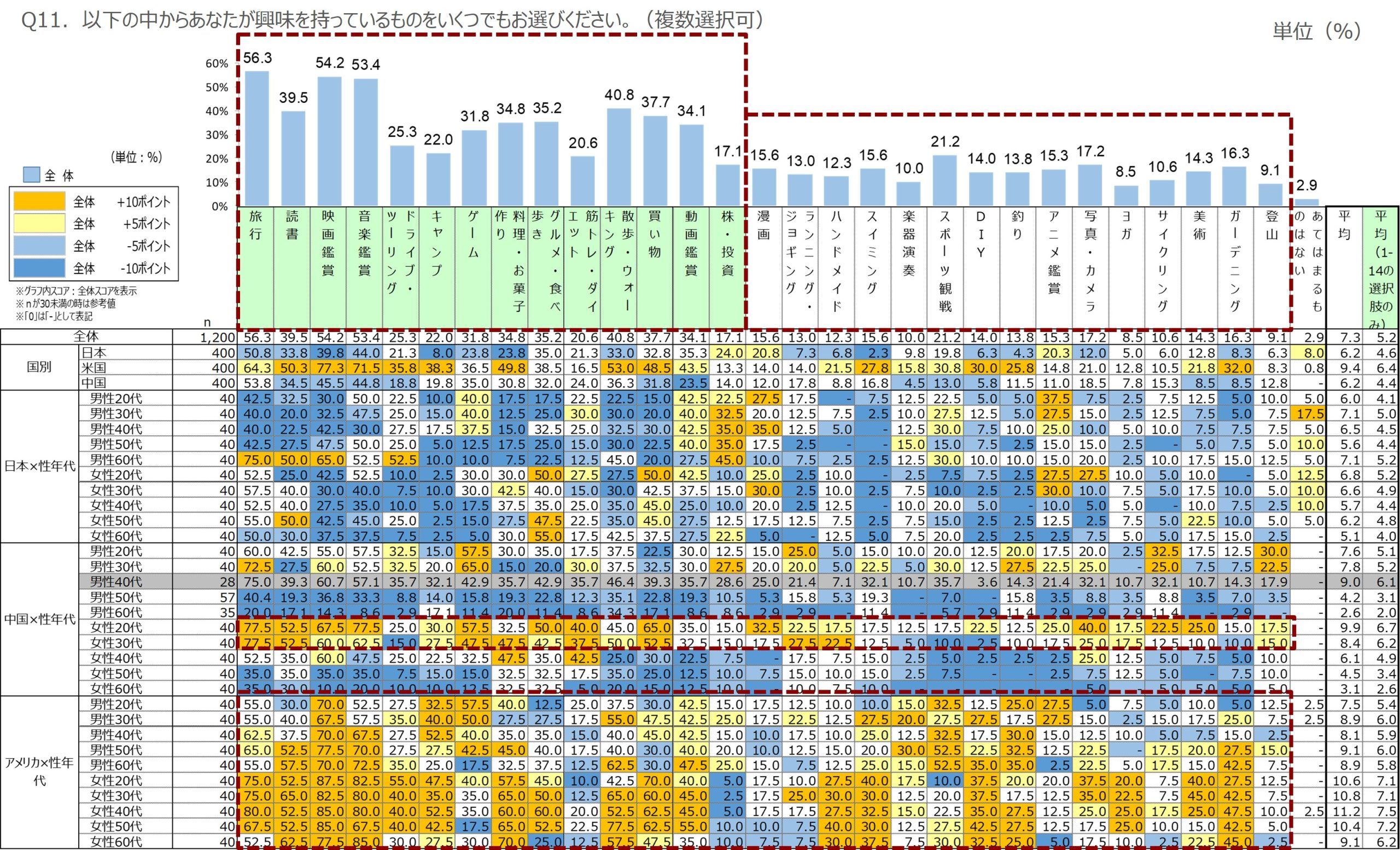 ちなみに、3か国で比較すると、「米国」や「中国の20~30代女性」で興味をもっている内容が多い傾向がみられることがわかります。