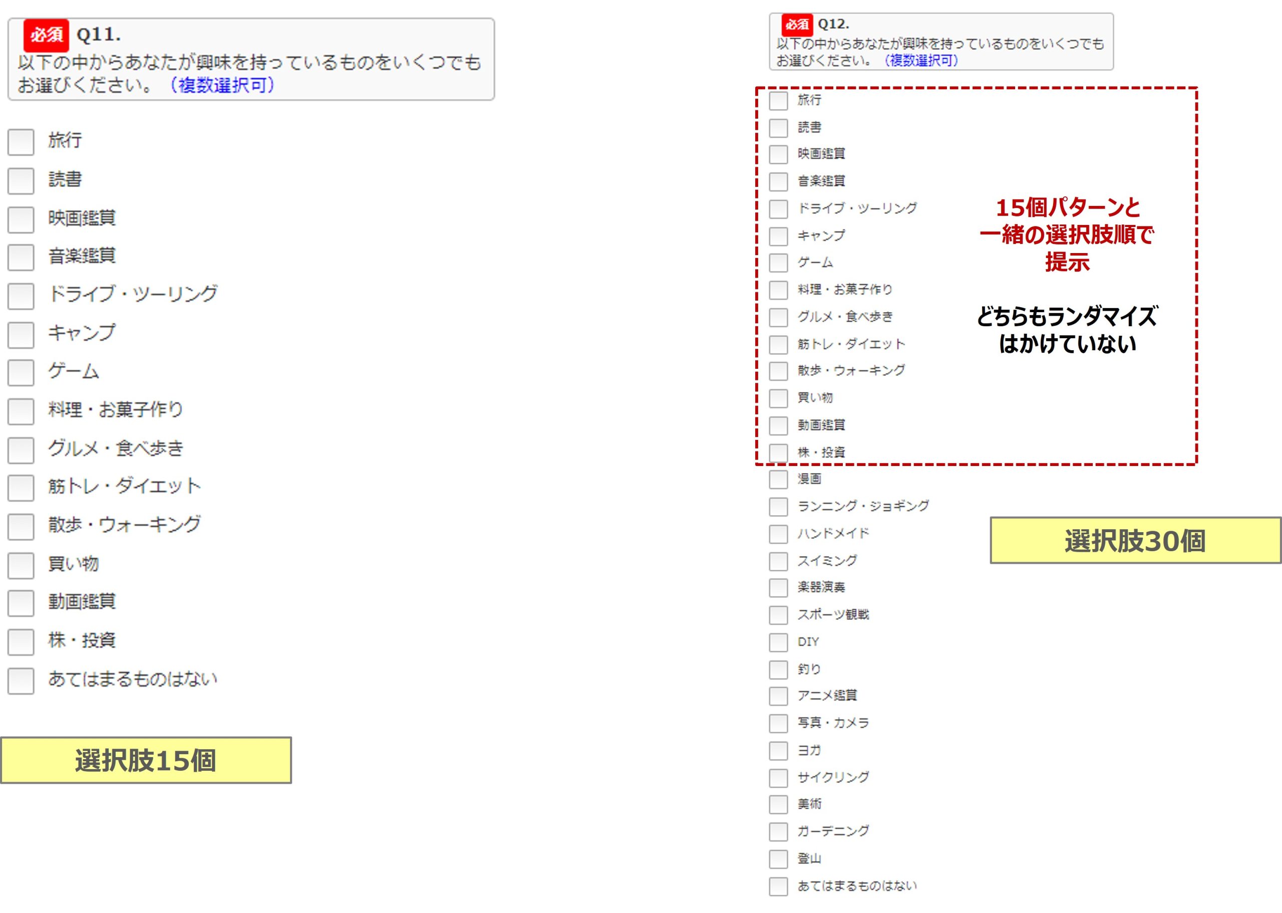左のQ11では、選択肢数が15個なのに対し、右のQ12では、選択肢数が30個となっています。