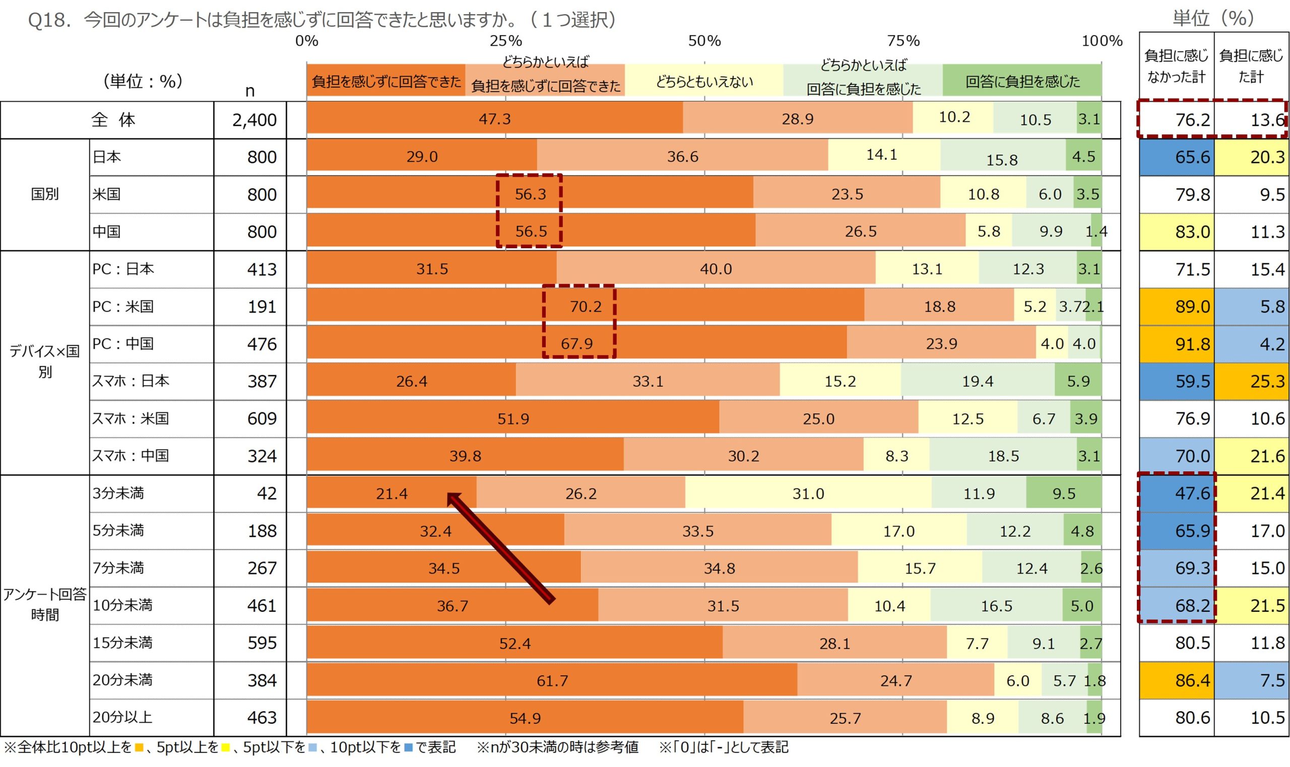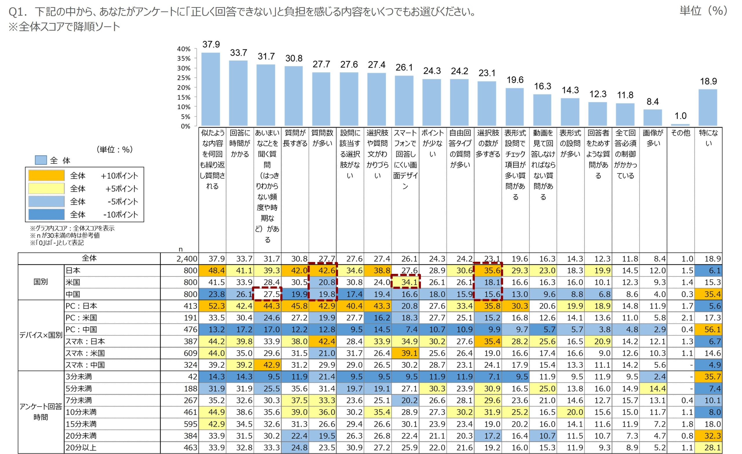 | 日本 | ・表形式設問でチェック項目が多い質問がある ・選択肢の数が多すぎる など ⇒ボリューム系のものに負担を感じている |