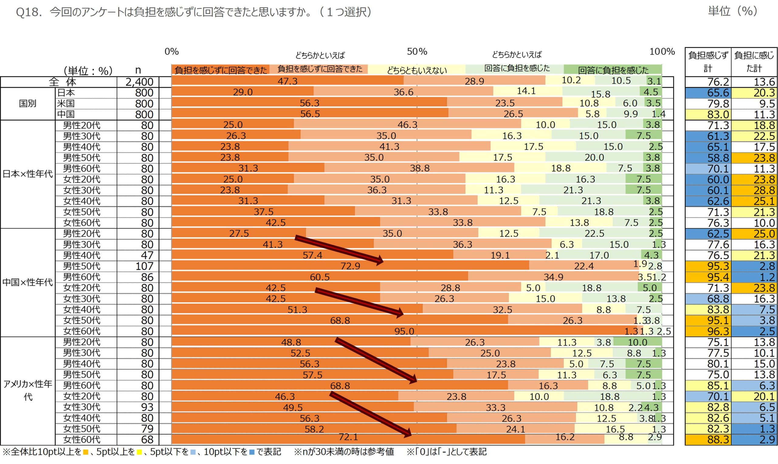 また、その内訳を国別で見てみると、日本と比べ、米国や中国は「負担と感じずに回答できた」の選択率が多い傾向にありました。