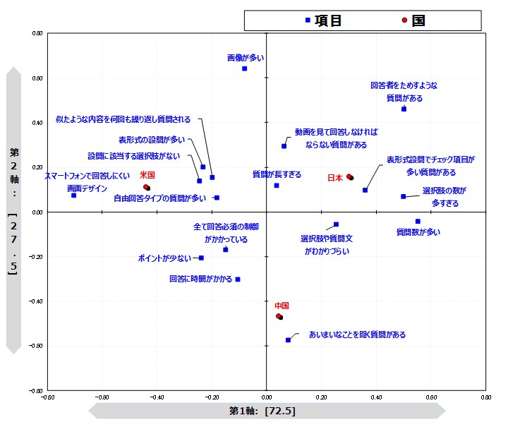 この図から、日本は「質問数が多い」や「選択肢の数が多すぎる」、米国は「スマートフォンで回答しにくい画面デザイン」が他の国と比べ多いことがわかります。