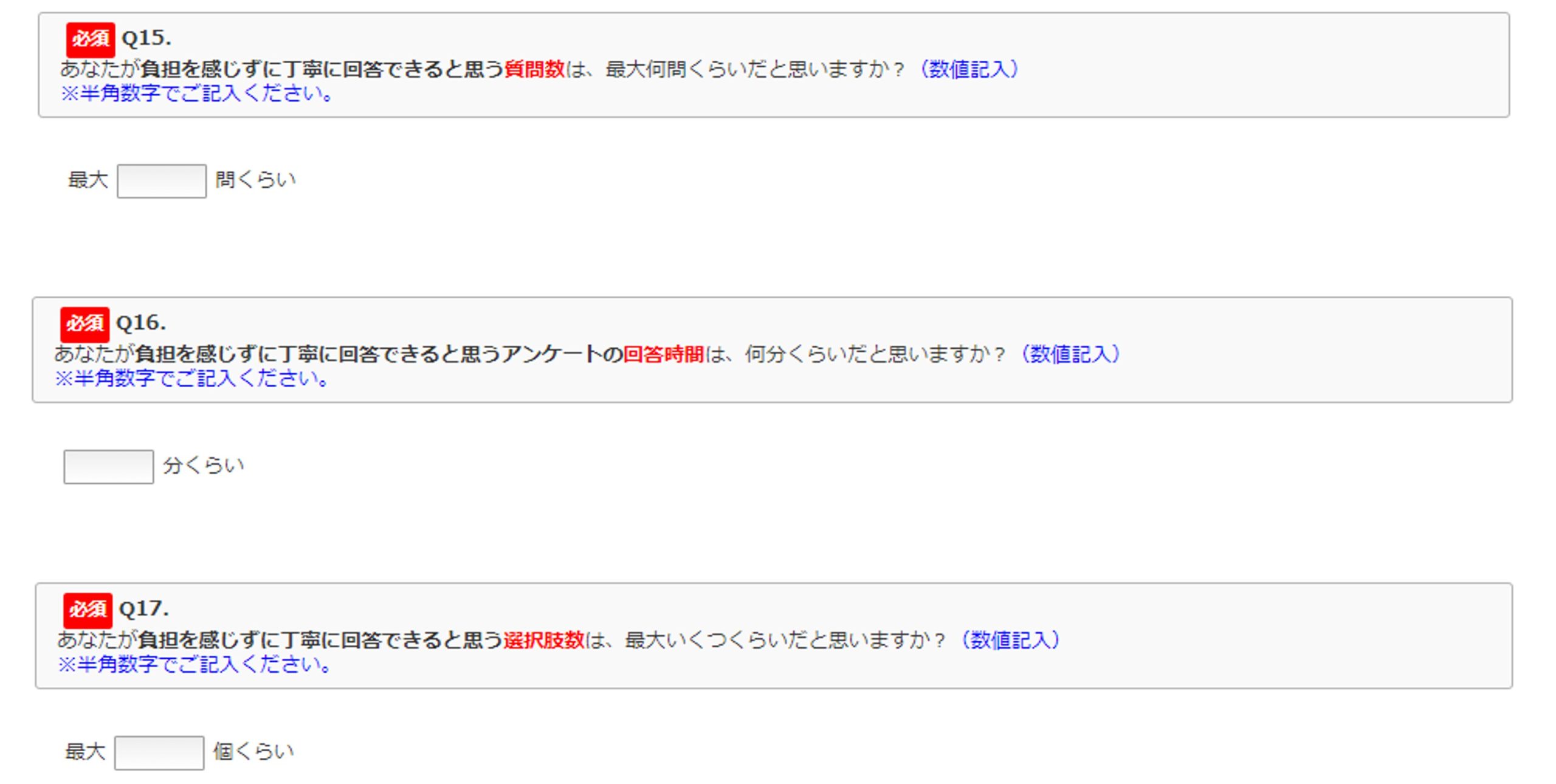 質問数や回答時間、選択肢数について数値を入力してもらう設問となっており、その結果が下図です。