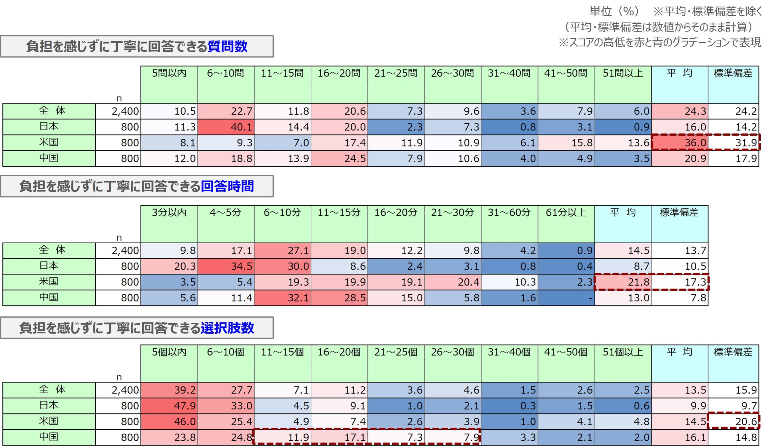結論、国ごとにやや違いがみられ興味深い結果となりました。具体的に、米国は丁寧に回答できる質問数の平均が36問と、他の国より多い結果となりました。
