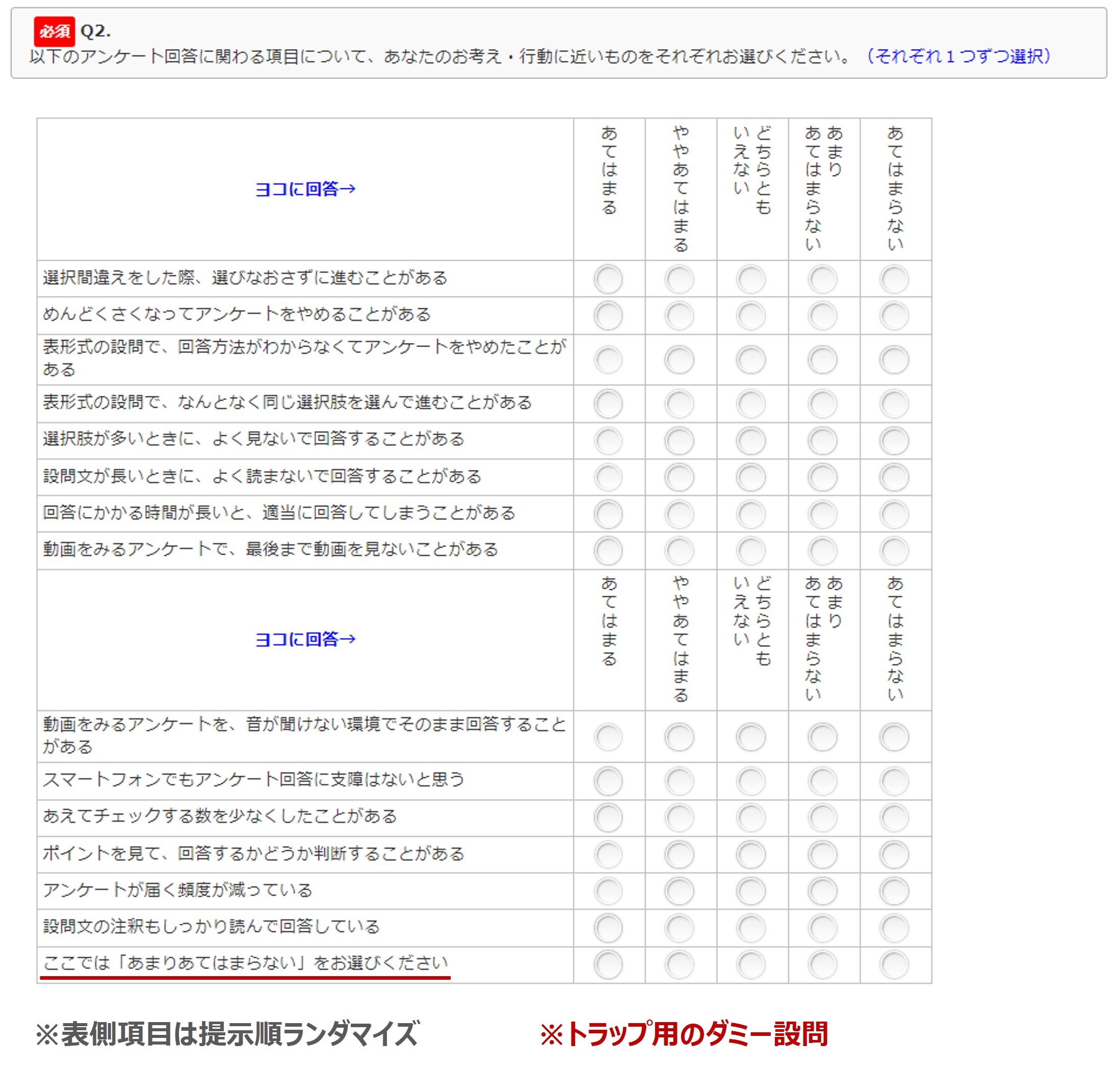この設問に回答いただくことで、アンケートの回答に対する考えや行動がわかります。そして、ここでは、一番下に「ここでは「あまりあてはまらない」をお選びください」というトラップ用のダミー設問を用意し、しっかり読んで、理解し、ちゃんと回答できるかどうかをチェックします。