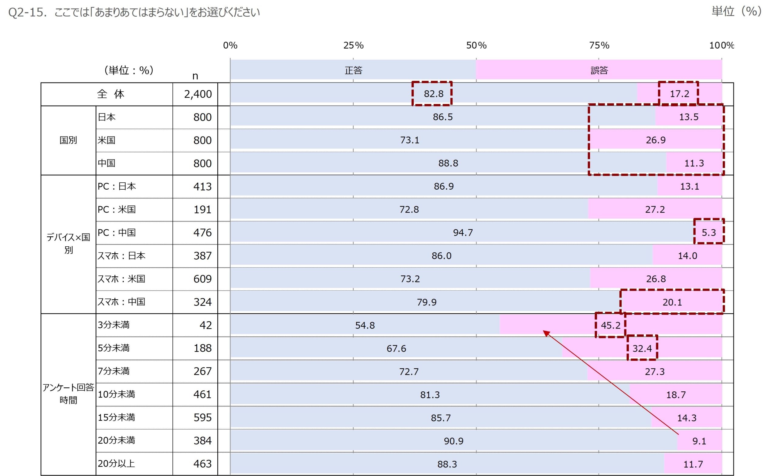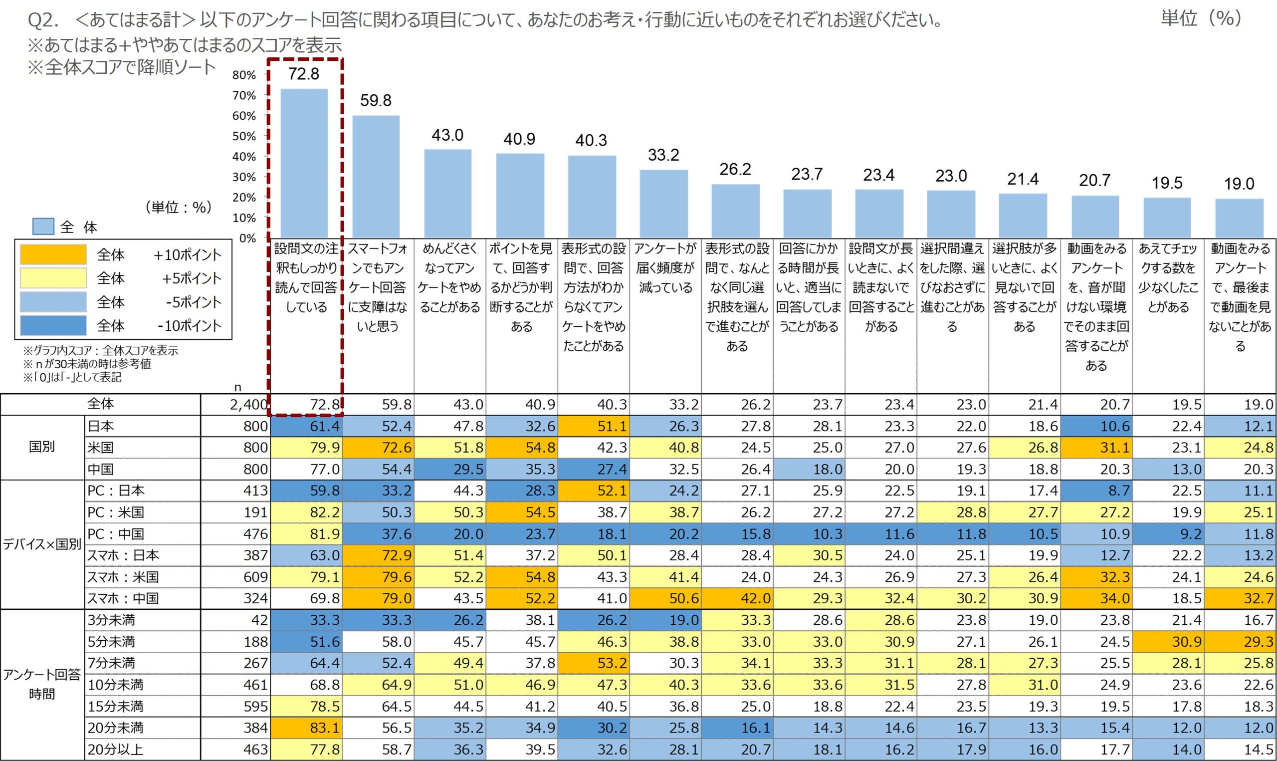 ここで注目していただきたいのは、左のほうで赤い点線で囲っている「設問文の注釈もしっかり読んで回答している」の72.8%という数値です。