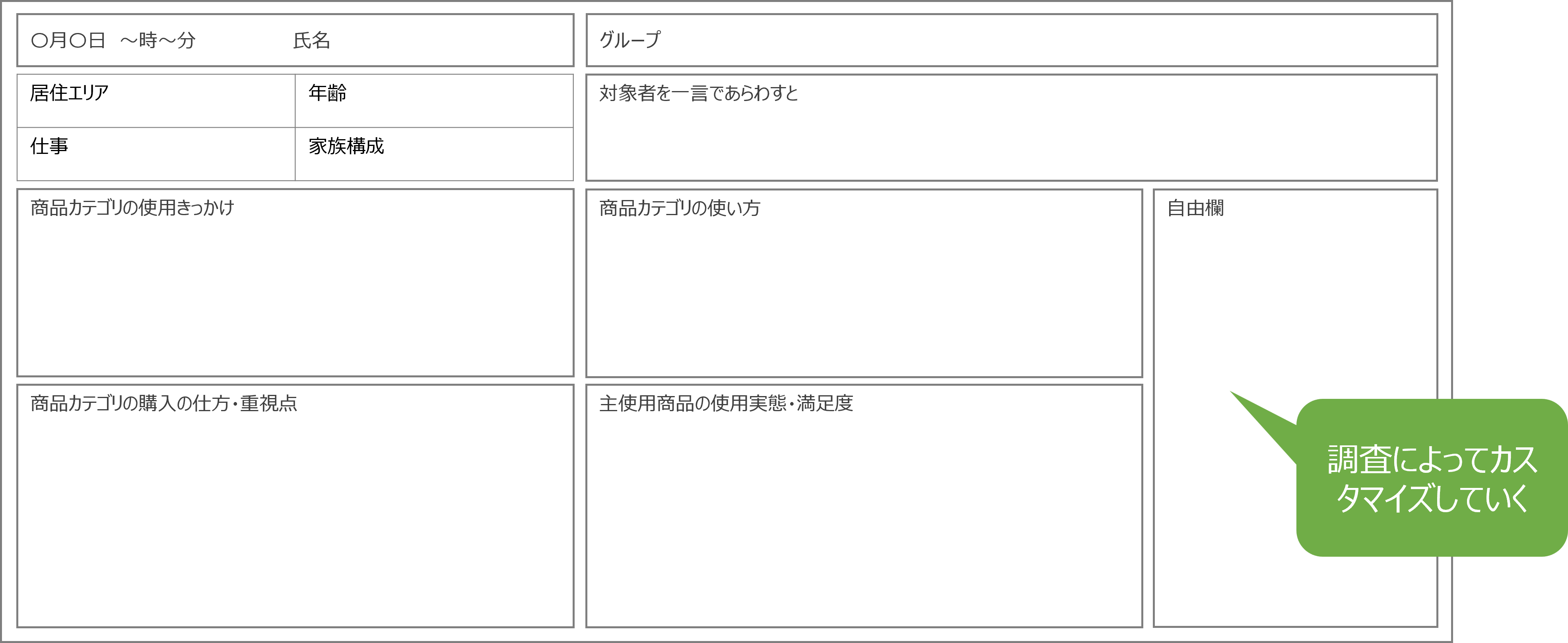 ここで重要なことは、繰り返しになりますが、聞いたこと・聞きたいことではなく、知りたいことにフォーカスするために作っていることです。そのため、発言一つ一つをメモしないようにし、商品やサービスの満足度を測るのではなく、「対象者がどうだったのか」「対象グループはどうだったのか」というように、「対象者は、この商品をどのように捉えているのか」という“人”に注目しましょう。