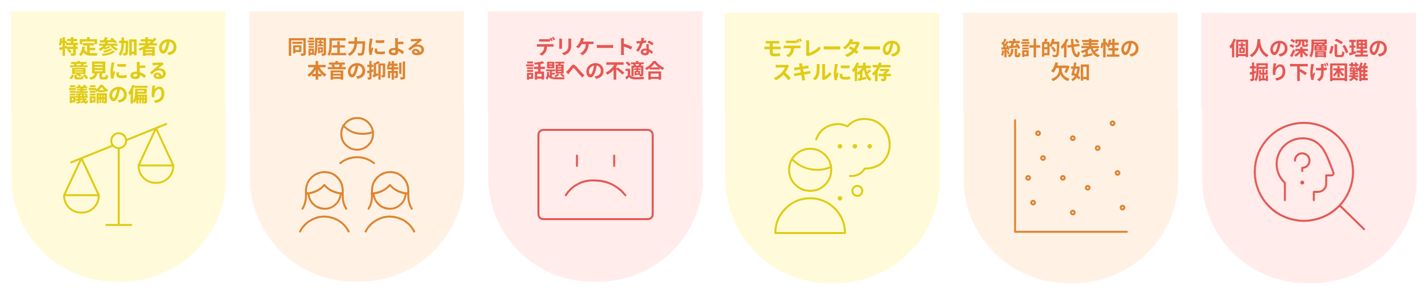 複数の参加者が限られた時間を共有するため、個々の意見を十分に掘り下げられないという構造的な制約があります。これにより、表面的な意見収集に留まり、深層の消費者心理に到達できないことがあります。