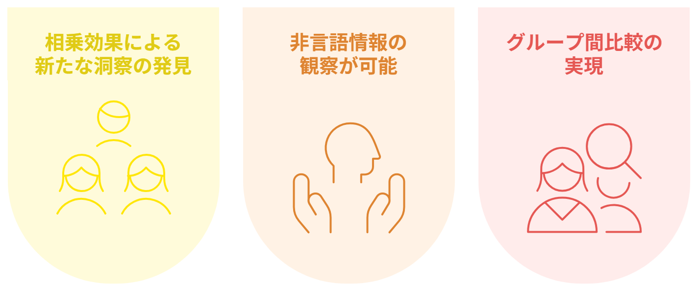 ※ グループダイナミクスとは、集団における個人の相互作用や影響力関係のことを指します。これが生まれることで、参加者の活発な議論が生まれ、思わぬ意見や新しいアイデアをインタビューから得られるようになります。