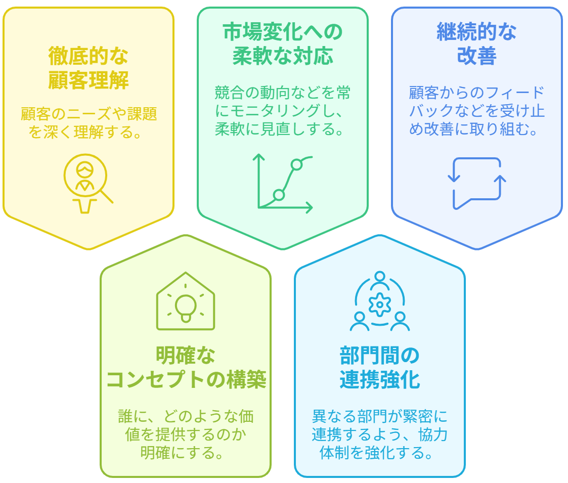 マーケティング視点を取り入れた商品開発を成功に導くには、以下の重要なポイントを意識し、組織全体で取り組む必要があります。