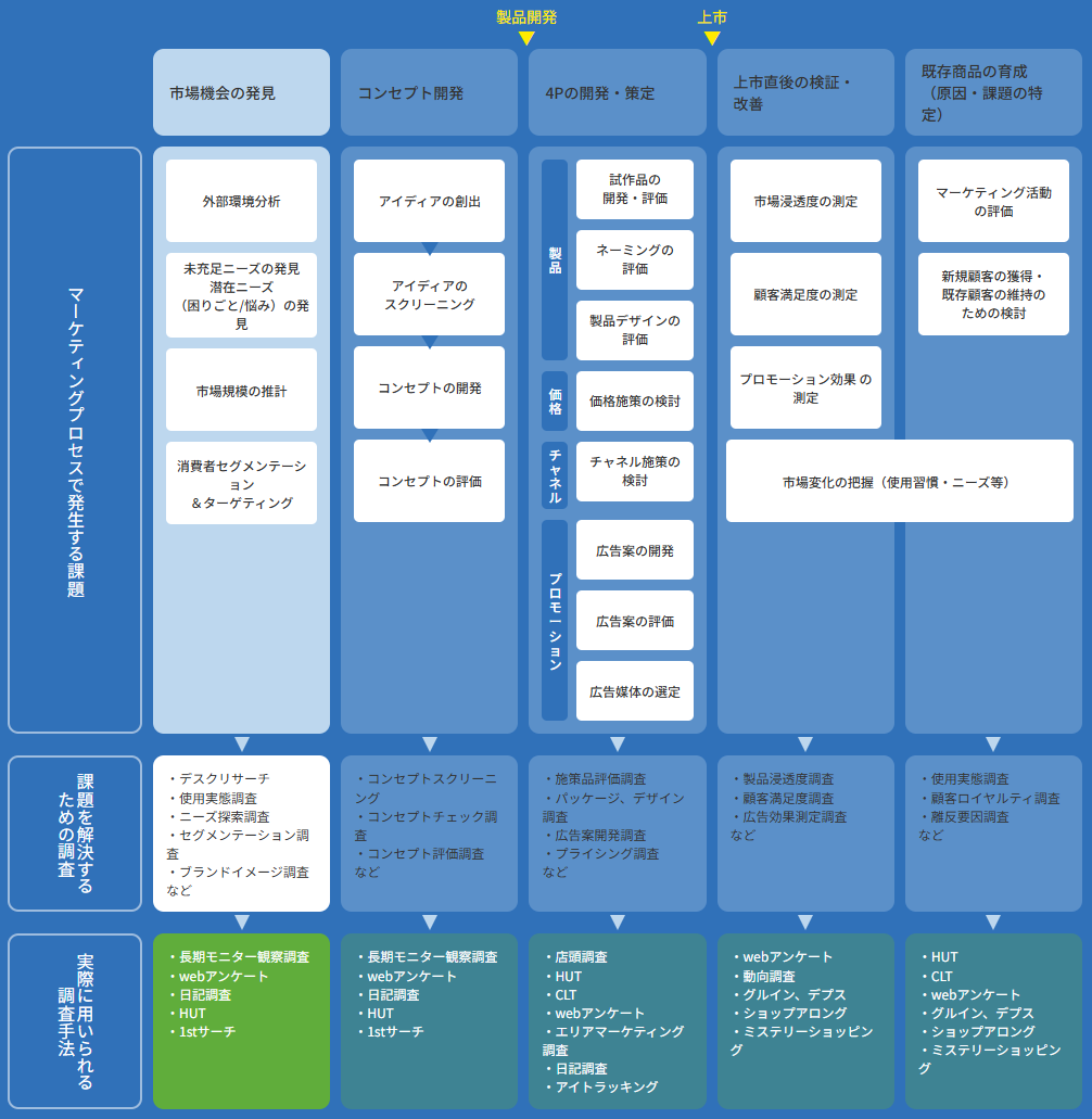このように、商品開発では上市前・上市後の両方において、継続的な調査と改善が求められます。