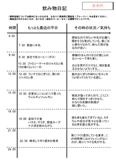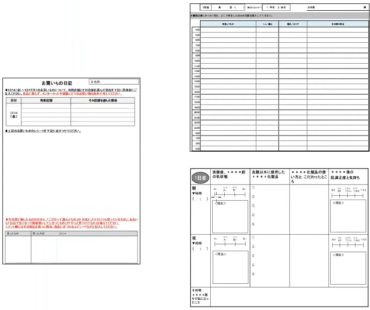 特徴は、その日に書いて記録に留めるので、正確な行動や気持ちが把握できることです。また、インタビュー前に対象者が実際の生活の中で、記録を書いていただくことによって、そのインタビューでお話いただく元となります。これは重要なことで、日記などを行わないインタビューでは、フラットな状況で伺える反面、顕在化したことのみでの話になってしまい、インタビュー内容の質として、もの足りないものになってしまう可能性があります。もちろん、他のグループインタビューの対象者のお話による刺激で、記憶を引き出されることもありますが、他社にゆだねる形ではなく、自分自身で思い出していただくことが大事だと考えております。