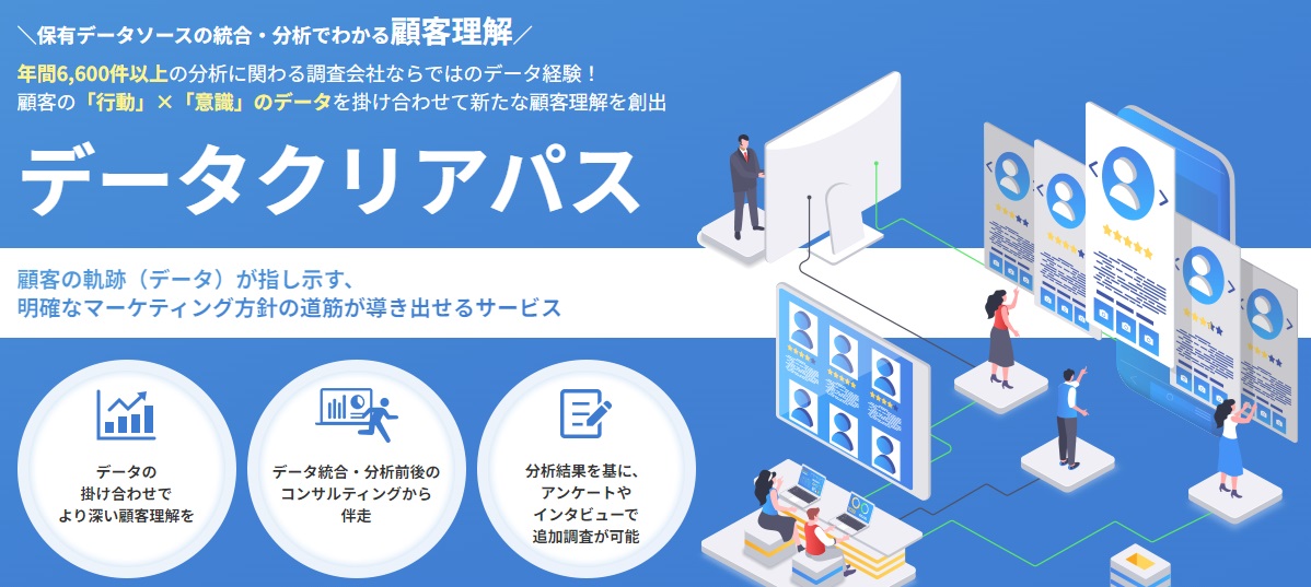 より一層データを活用してビジネスに役立てたいとお考えなら、「データクリアパス」サービスが最適です。「データクリアパス」は、顧客の購買履歴や行動データ、アンケート結果を統合し、顧客ニーズや行動パターンの深い理解を可能にします。このサービスは、BIツールとの相乗効果で、データの収集から分析、そして具体的な戦略の立案までを包括的にサポートします。マーケティング戦略の精度を高め、競争優位性を獲得するために、ぜひご活用ください。