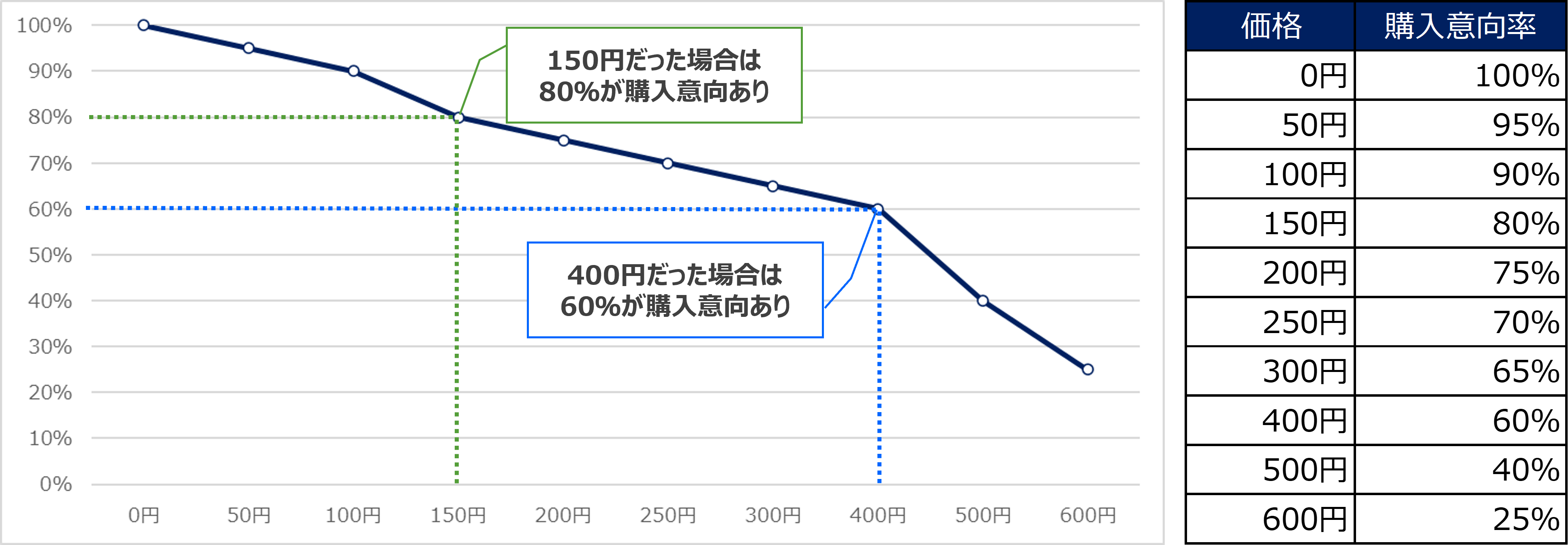 例えば、調査における販売想定価格が400円、目標とする購入意向率が80%場合、価格が400円であれば60%の回答者が、150円であれば80%の回答者が「購入意向あり」と回答しています。従って、目標とする購入意向率に400円では満たないため、販売価格を検討する必要があります。