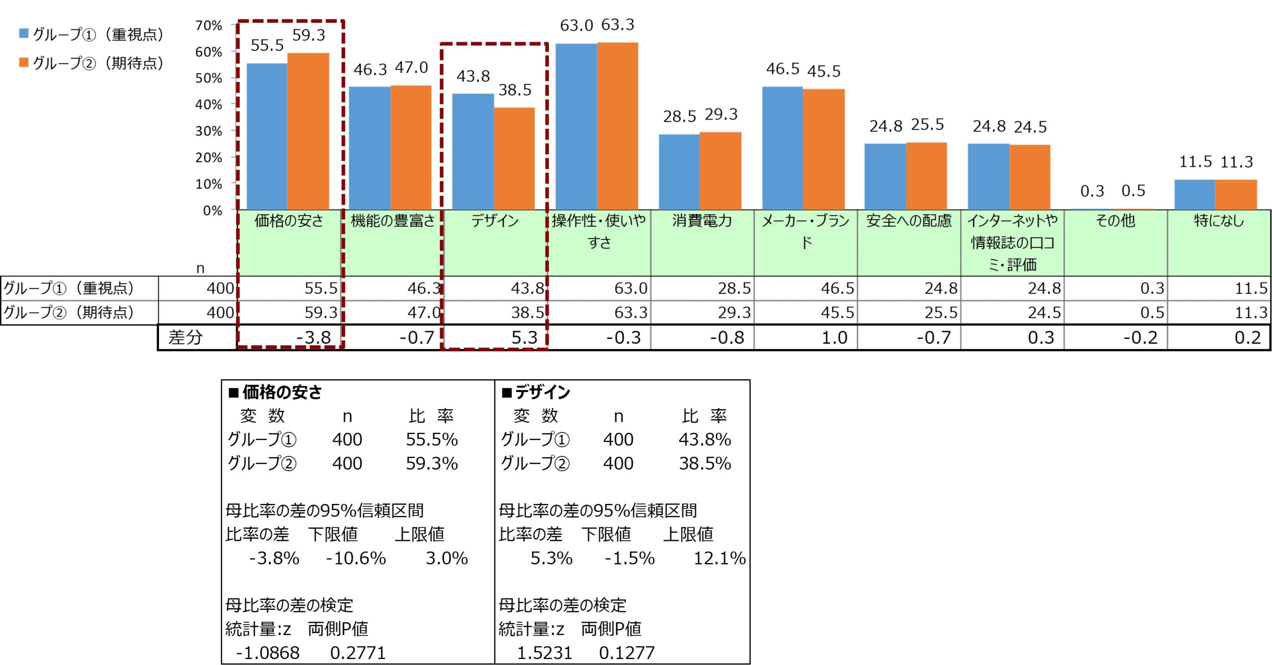 そして、差がやや見えるところとして、「価格の安さ」で-3.8pt、「デザイン」で5.3pt差が挙げられます。この差があるかどうかを検定してみると、統計的に有意な差とは言えない結果となりました。上図の下部分にある「両側P値」を注目してみると、検定の結果としてこれぐらいの差が出る確率が「価格の安さ」では、約27%、「デザイン」では約13%あることがわかります。そのため、今回は「重視点」と「期待点」という聞き方の違いで、回答に大きな違いがでることはないと、考えることにします。